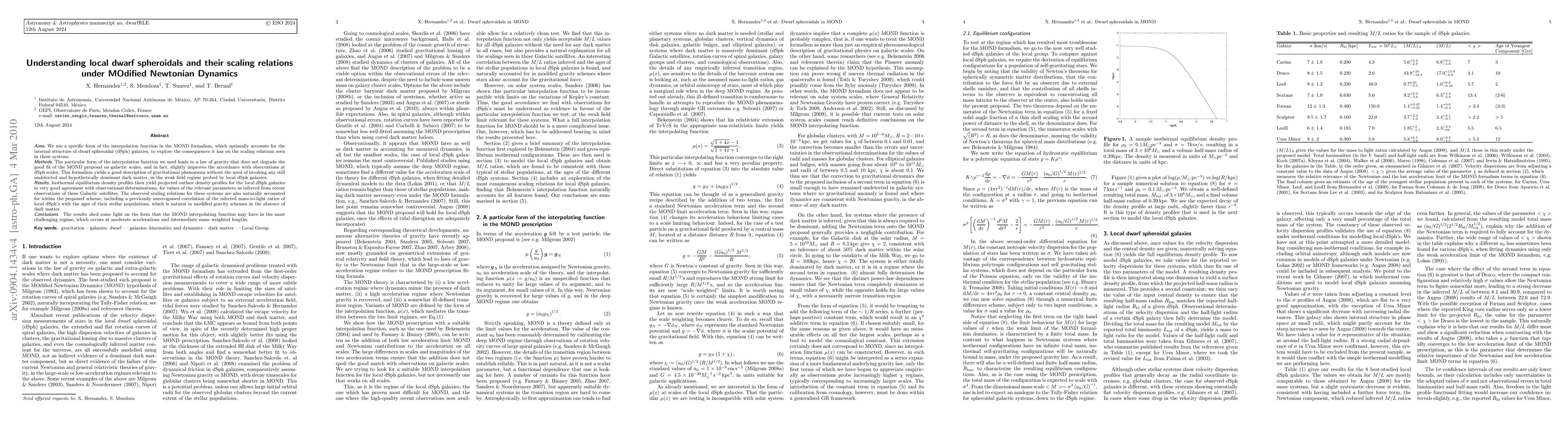 We use a specific form of the interpolation function in the MOND formalism, which optimally accounts for the internal structure of dwarf spheroidal (dSph) galaxies, to explore the consequences it has on the scaling relations seen in these systems.}} {{The particular form of the interpolation function we used leads to a law of gravity that does not degrade the good fit of the MOND proposal on galactic scales, and in fact, slightly improves the accordance with observations at dSph scales. This formalism yields a good description of gravitational phenomena without the need of invoking any still undetected and hypothetically dominant dark matter, in the weak field regime probed by local dSph galaxies.}} {{Isothermal equilibrium density profiles then yield projected surface density profiles for the local dSph galaxies in very good agreement with observational determinations, for values of the relevant parameters as inferred from recent observations of these Galactic satellites. The observed scaling relations for these systems are also naturally accounted for within the proposed scheme, including a previously unrecognised correlation of the inferred mass-to-light ratios of local dSph's with the ages of their stellar populations, which is natural in modified gravity schemes in the absence of dark matter.}} {The results shed some light on the form that the MOND interpolating function may have in the most challenging regime, which occurs at moderate accelerations and intermediate mass--weighted lengths.