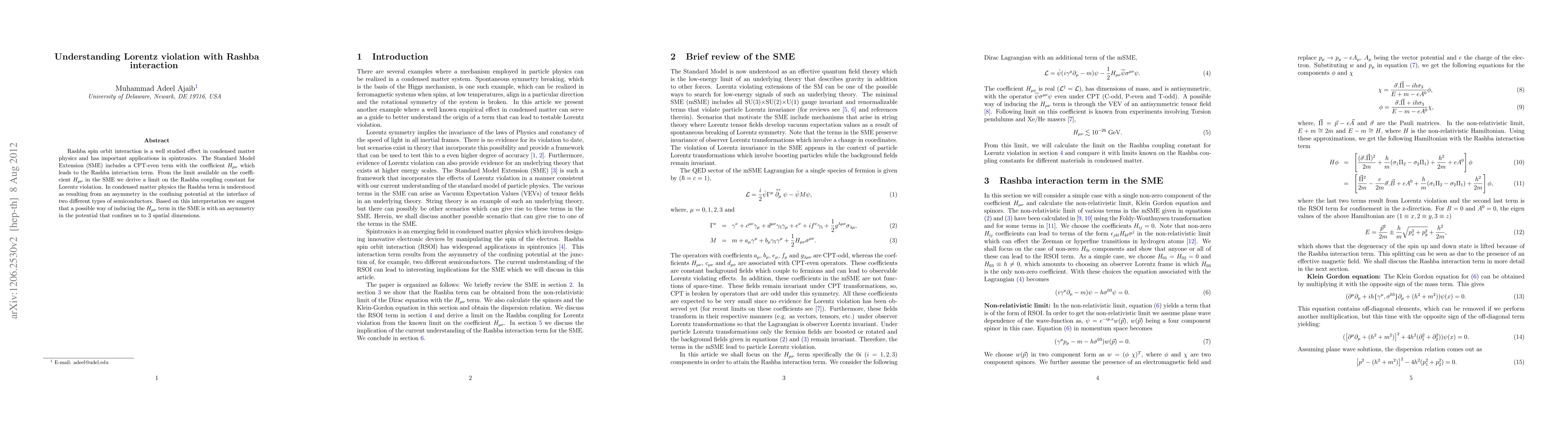 This paper investigates the connection between Lorentz violation and the Rashba spin-orbit interaction, deriving a limit on the Rashba coupling constant from the Standard Model Extension's CPT-even term. It proposes that an asymmetry in the potential confining us to three spatial dimensions could induce the H_{\mu \nu} term, linking condensed matter physics to fundamental physics.