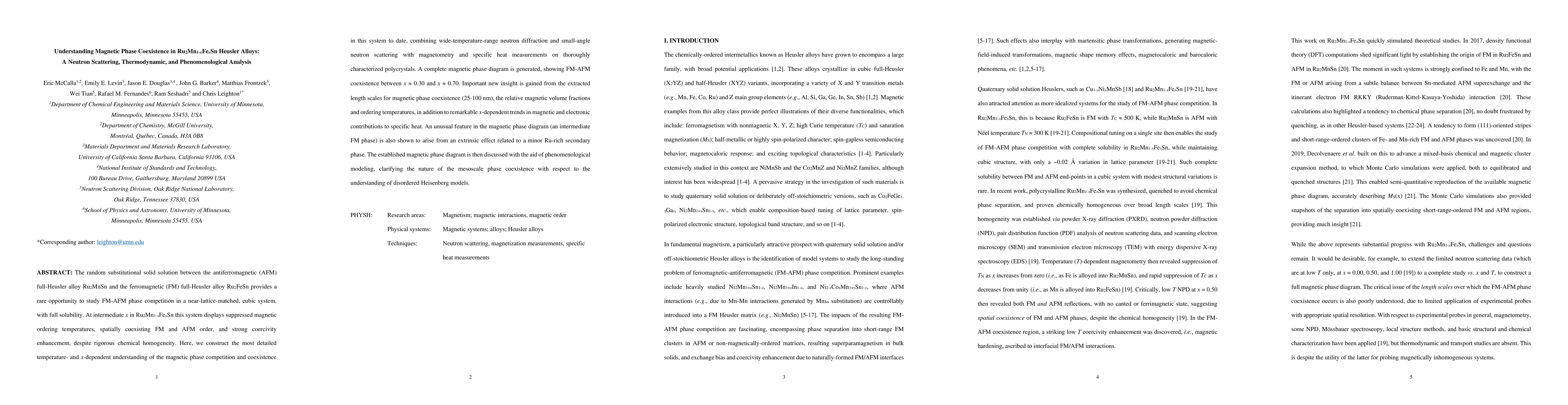 This paper investigates the magnetic phase coexistence in Ru$_2$Mn$_{1-x}$Fe$_x$Sn Heusler alloys using neutron scattering, thermodynamic, and phenomenological analysis. It reveals FM-AFM coexistence between $x \approx 0.30$ and $x \approx 0.70$, with detailed insights into length scales, magnetic volume fractions, and specific heat contributions, while identifying an extrinsic effect causing an intermediate FM phase.
