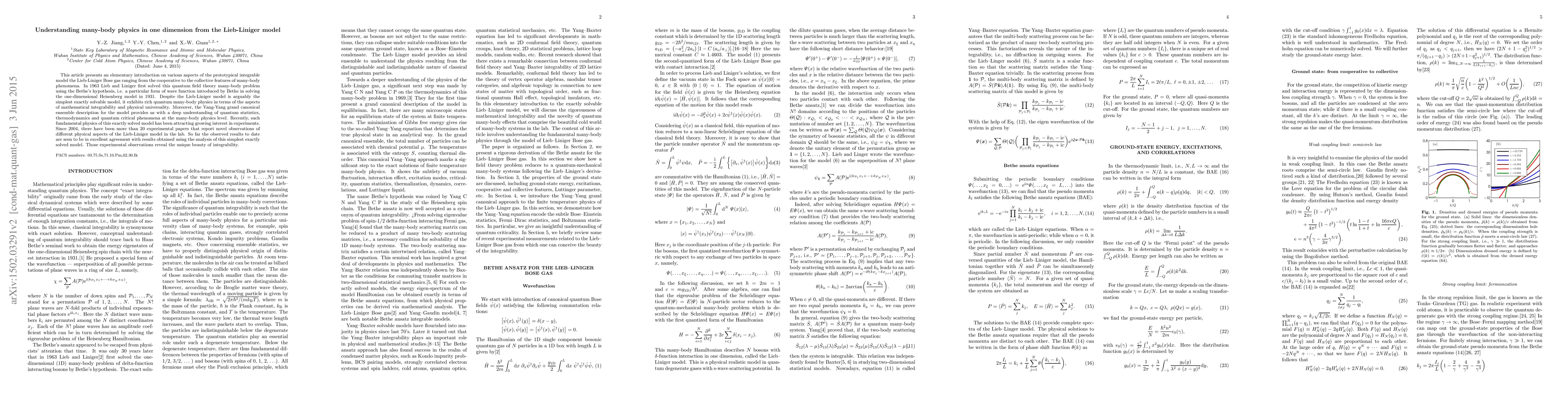 This article presents an elementary introduction on various aspects of the prototypical integrable model the Lieb-Liniger Bose gas ranging from the cooperative to the collective features of many-body phenomena [1]. In 1963 Lieb and Liniger first solved this quantum field theory many-body problem using the Bethe's hypothesis, i.e. a particular form of wave function introduced by Bethe in solving the one-dimensional Heisenberg model in 1931. Despite the Lieb-Liniger model is arguably the simplest exactly solvable model, it exhibits rich quantum many-body physics in terms of the aspects of mathematical integrability and physical universality. Moreover, the Yang-Yang grand canonical ensemble description for the model provides us with a deep understanding of quantum statistics, thermodynamics and quantum critical phenomena at the many-body physics level. Recently, such fundamental physics of this exactly solved model has been attracting growing interest in experiments. Since 2004, there have been more than 20 experimental papers that report novel observations of different physical aspects of the Lieb-Liniger model in the lab. So far the observed results to date are seen to be in excellent agreement with results obtained using the analysis of this simplest exactly solved model. Those experimental observations reveal the unique beauty of integrability.