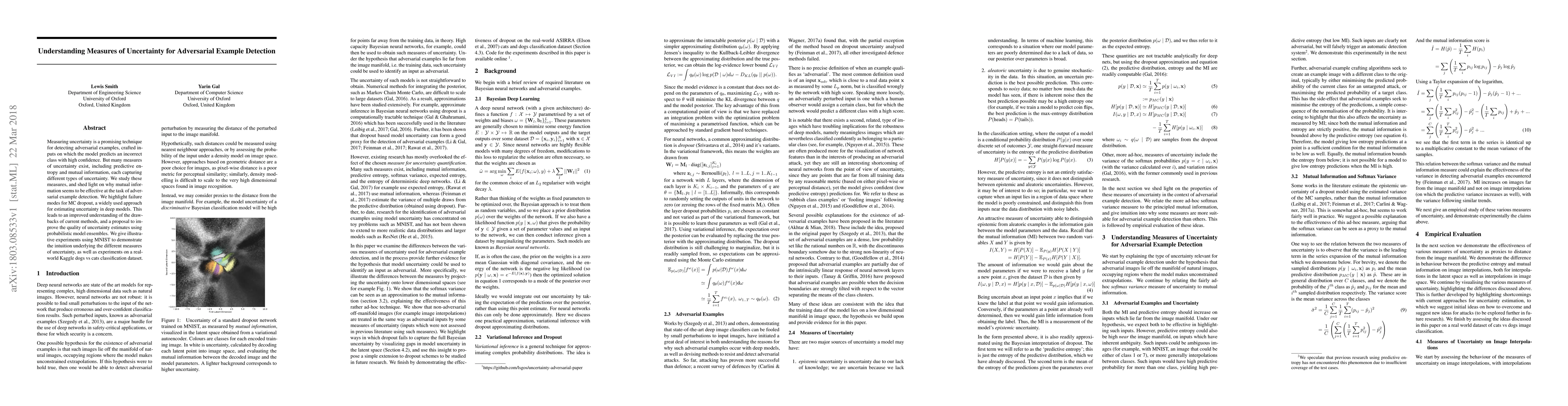 Measuring uncertainty is a promising technique for detecting adversarial examples, crafted inputs on which the model predicts an incorrect class with high confidence. But many measures of uncertainty exist, including predictive en- tropy and mutual information, each capturing different types of uncertainty. We study these measures, and shed light on why mutual information seems to be effective at the task of adversarial example detection. We highlight failure modes for MC dropout, a widely used approach for estimating uncertainty in deep models. This leads to an improved understanding of the drawbacks of current methods, and a proposal to improve the quality of uncertainty estimates using probabilistic model ensembles. We give illustrative experiments using MNIST to demonstrate the intuition underlying the different measures of uncertainty, as well as experiments on a real world Kaggle dogs vs cats classification dataset.