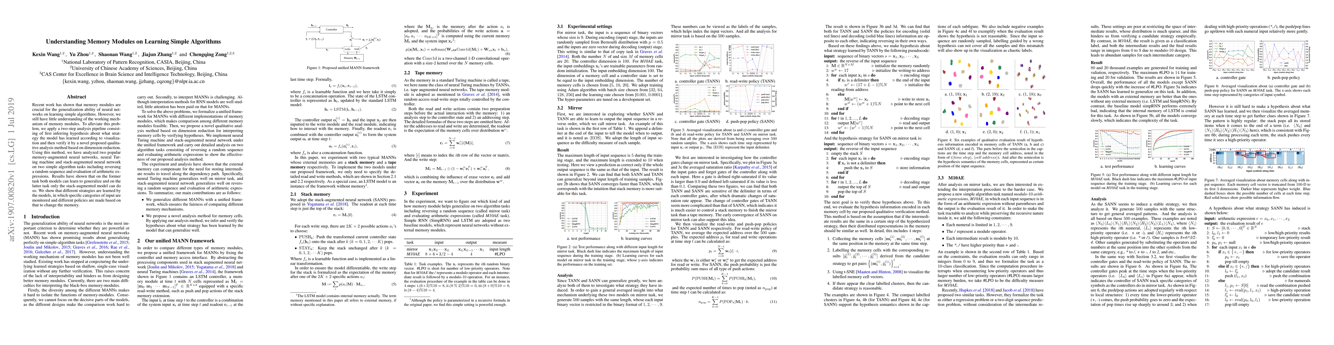 Recent work has shown that memory modules are crucial for the generalization ability of neural networks on learning simple algorithms. However, we still have little understanding of the working mechanism of memory modules. To alleviate this problem, we apply a two-step analysis pipeline consisting of first inferring hypothesis about what strategy the model has learned according to visualization and then verify it by a novel proposed qualitative analysis method based on dimension reduction. Using this method, we have analyzed two popular memory-augmented neural networks, neural Turing machine and stack-augmented neural network on two simple algorithm tasks including reversing a random sequence and evaluation of arithmetic expressions. Results have shown that on the former task both models can learn to generalize and on the latter task only the stack-augmented model can do so. We show that different strategies are learned by the models, in which specific categories of input are monitored and different policies are made based on that to change the memory.