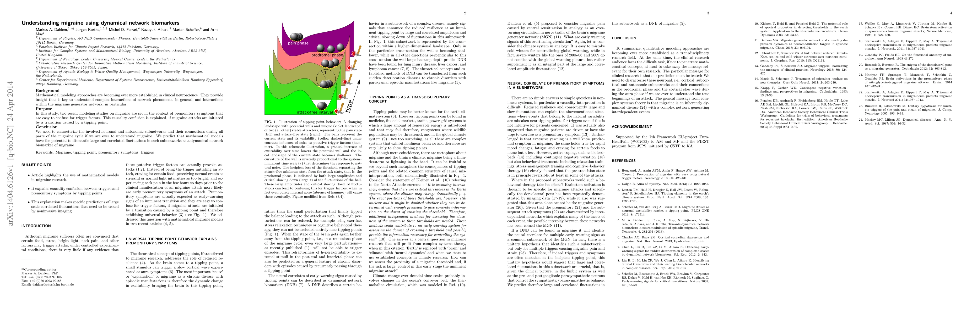 Background: Mathematical modeling approaches are becoming ever more established in clinical neuroscience. They provide insight that is key to understand complex interactions of network phenomena, in general, and interactions within the migraine generator network, in particular. Purpose: In this study, two recent modeling studies on migraine are set in the context of premonitory symptoms that are easy to confuse for trigger factors. This causality confusion is explained, if migraine attacks are initiated by a transition caused by a tipping point. Conclusion: We need to characterize the involved neuronal and autonomic subnetworks and their connections during all parts of the migraine cycle if we are ever to understand migraine. We predict that mathematical models have the potential to dismantle large and correlated fluctuations in such subnetworks as a dynamical network biomarker of migraine.