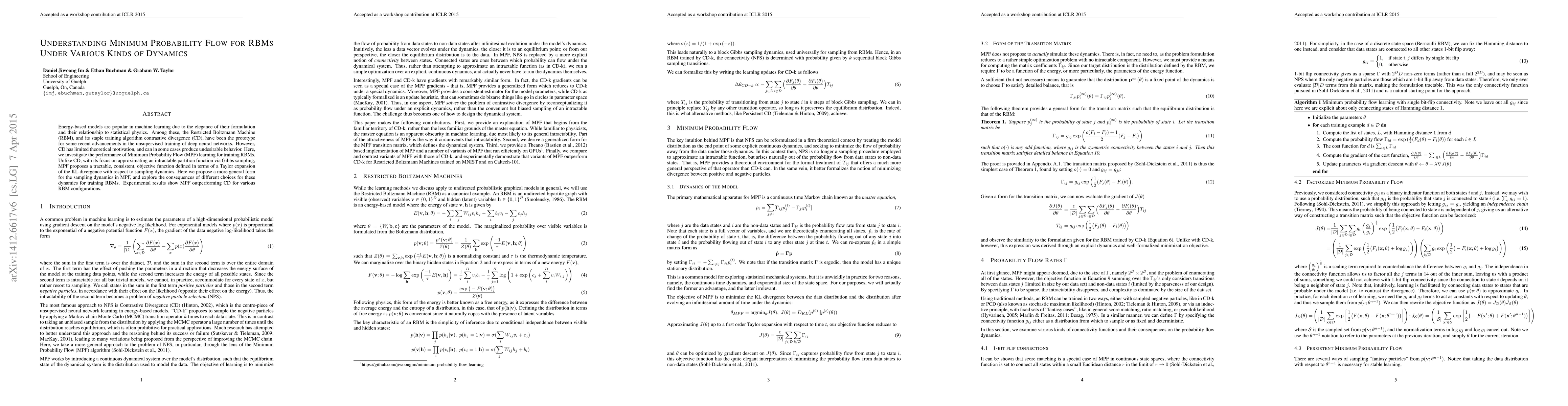 Energy-based models are popular in machine learning due to the elegance of their formulation and their relationship to statistical physics. Among these, the Restricted Boltzmann Machine (RBM), and its staple training algorithm contrastive divergence (CD), have been the prototype for some recent advancements in the unsupervised training of deep neural networks. However, CD has limited theoretical motivation, and can in some cases produce undesirable behavior. Here, we investigate the performance of Minimum Probability Flow (MPF) learning for training RBMs. Unlike CD, with its focus on approximating an intractable partition function via Gibbs sampling, MPF proposes a tractable, consistent, objective function defined in terms of a Taylor expansion of the KL divergence with respect to sampling dynamics. Here we propose a more general form for the sampling dynamics in MPF, and explore the consequences of different choices for these dynamics for training RBMs. Experimental results show MPF outperforming CD for various RBM configurations.