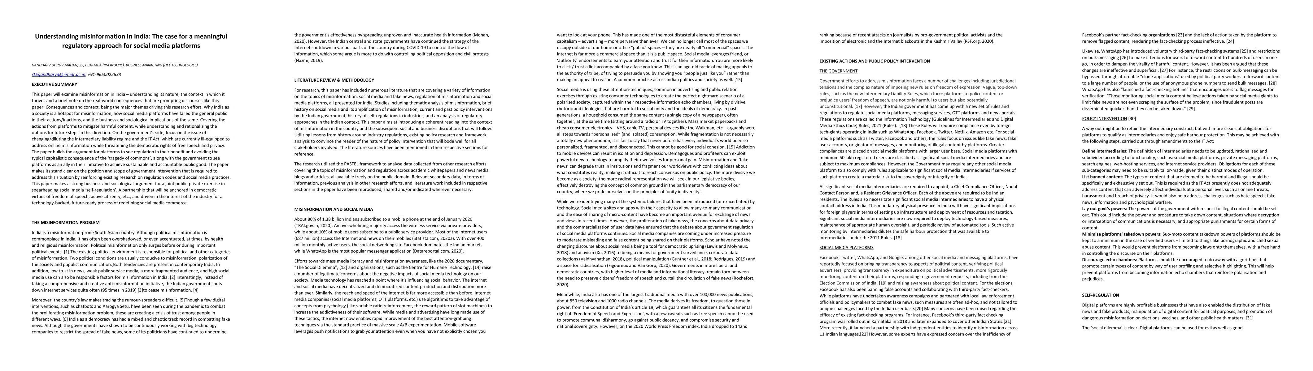 For research, this paper has included numerous literature that are covering a variety of information on the topics of misinformation, social media and fake news, regulation of misinformation and social media platforms, all presented for India. Studies including thematic analysis of misinformation, brief history on social media and its amplification of misinformation, current and past policy interventions by the Indian government, history of self-regulations in industries, and an analysis of regulatory approaches in the Indian context. This paper aims at introducing a coherent reading into the context of misinformation in the country and the subsequent social and business disruptions that will follow. Utilizing lessons from history around industry regulations, existing policy research and framework analysis to convince the reader of the nature of policy intervention that will bode well for all stakeholders involved. The literature sources have been mentioned in their respective sections for reference. The research utilized the PASTEL framework to analyse data collected from other research efforts covering the topic of misinformation and regulation across academic whitepapers and news media blogs and articles, all available freely on the public domain. Relevant secondary data, in terms of information, previous analysis in other research efforts, and literature work included in respective sections in the paper have been reproduced, shared and/or indicated wherever necessary.