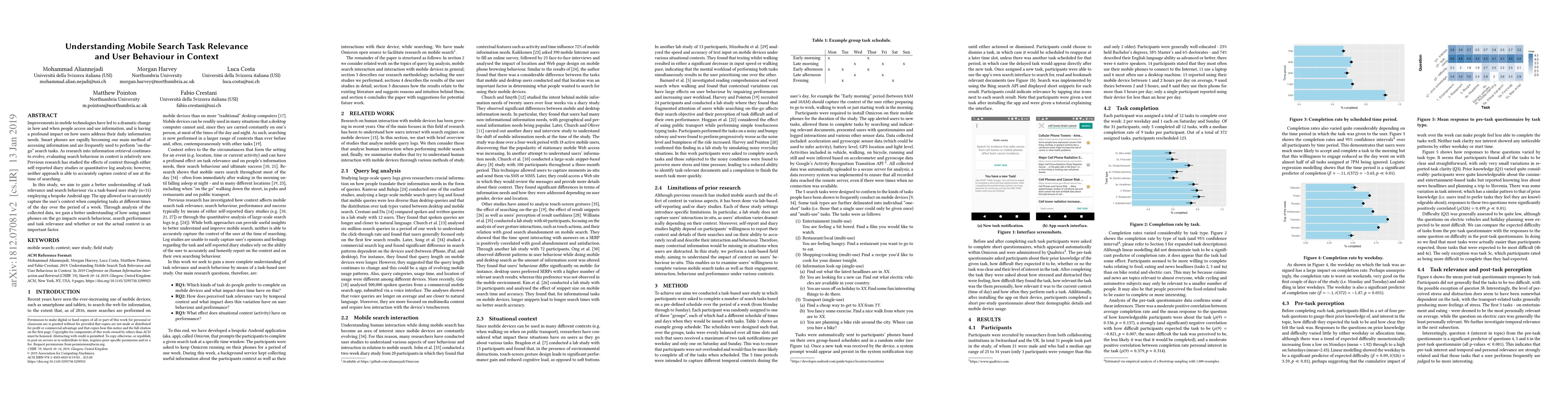 A user study using a bespoke Android app found that mobile search task relevance and user behavior vary greatly depending on the time of day, with users performing better in certain contexts. The research highlights the importance of considering context when evaluating search performance and task relevance.