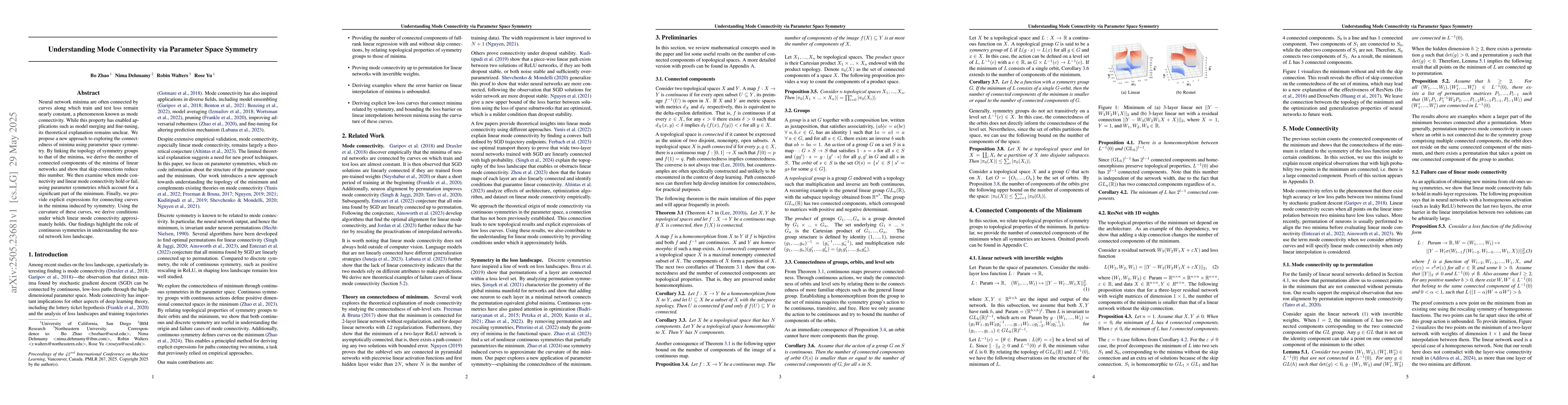 Researchers explore mode connectivity in neural networks using parameter space symmetry, finding that skip connections reduce connected components and conditions exist for linear mode connectivity to hold.