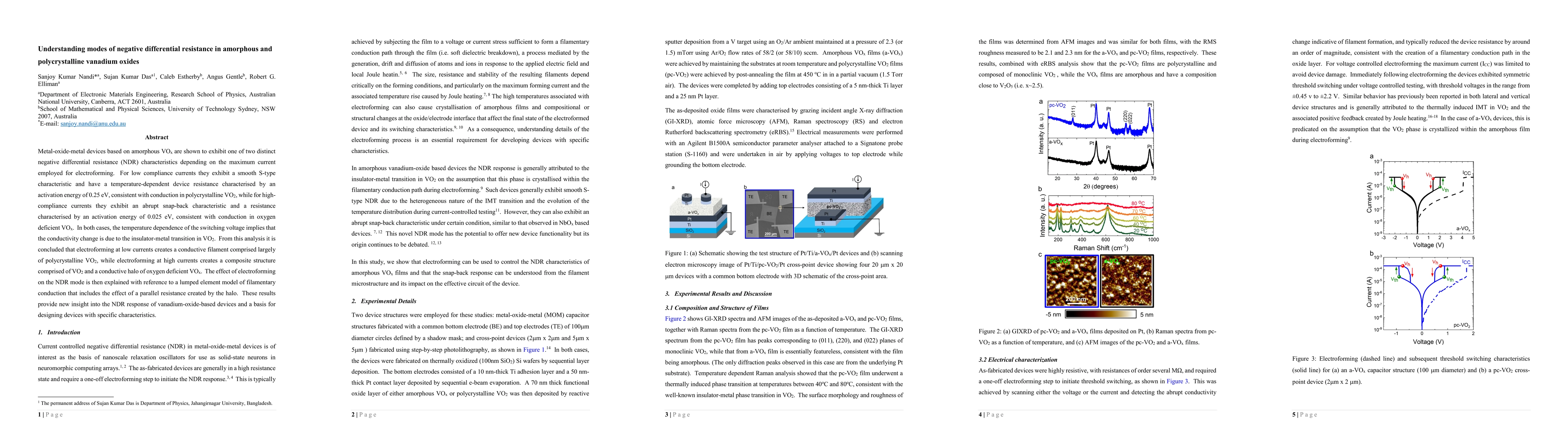 This paper explores the negative differential resistance (NDR) in amorphous VOx devices, revealing two distinct NDR characteristics depending on electroforming current. Low-current electroforming results in an S-type NDR with polycrystalline VO2 conduction, while high-current electroforming produces a snap-back NDR with oxygen deficient VOx conduction, suggesting different conductive filament structures.