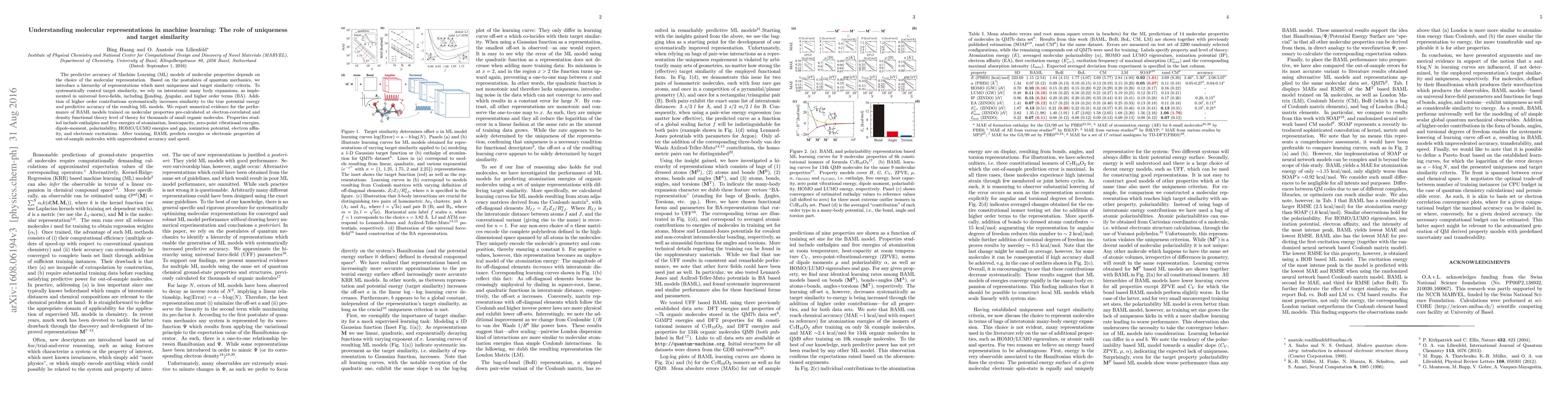 The predictive accuracy of Machine Learning (ML) models of molecular properties depends on the choice of the molecular representation. Based on the postulates of quantum mechanics, we introduce a hierarchy of representations which meet uniqueness and target similarity criteria. To systematically control target similarity, we rely on interatomic many body expansions, as implemented in universal force-fields, including Bonding, Angular, and higher order terms (BA). Addition of higher order contributions systematically increases similarity to the true potential energy and predictive accuracy of the resulting ML models. We report numerical evidence for the performance of BAML models trained on molecular properties pre-calculated at electron-correlated and density functional theory level of theory for thousands of small organic molecules. Properties studied include enthalpies and free energies of atomization, heatcapacity, zero-point vibrational energies, dipole-moment, polarizability, HOMO/LUMO energies and gap, ionization potential, electron affinity, and electronic excitations. After training, BAML predicts energies or electronic properties of out-of-sample molecules with unprecedented accuracy and speed.