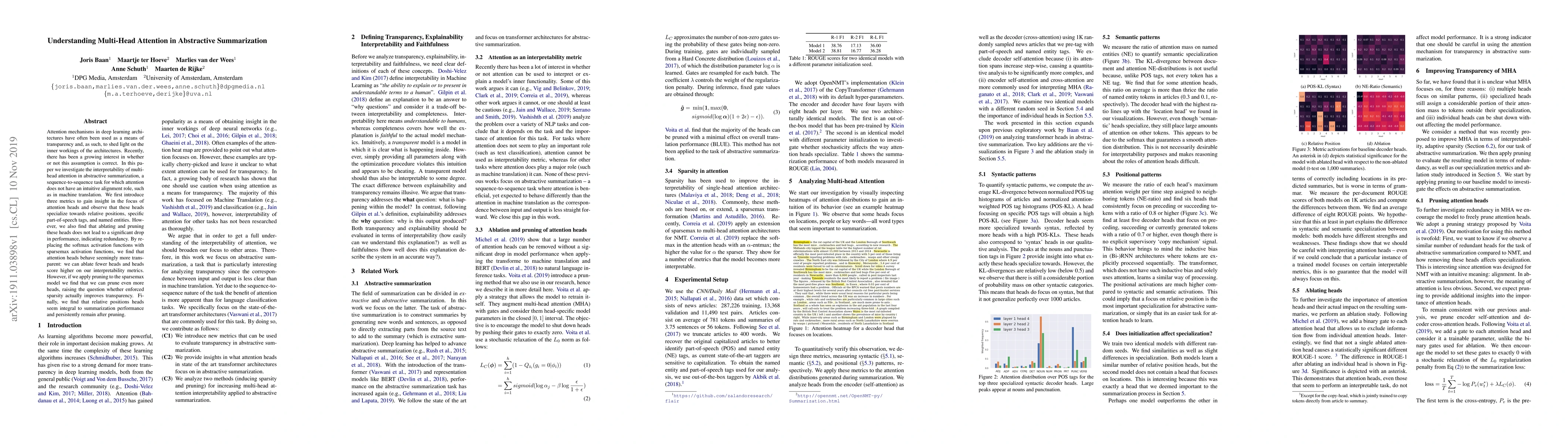 This paper explores the interpretability of multi-head attention in abstractive summarization, finding that attention heads specialize in focusing on relative positions, specific tags, and named entities. Despite their specialization, removing or pruning these heads does not significantly impact performance, suggesting redundancy.
