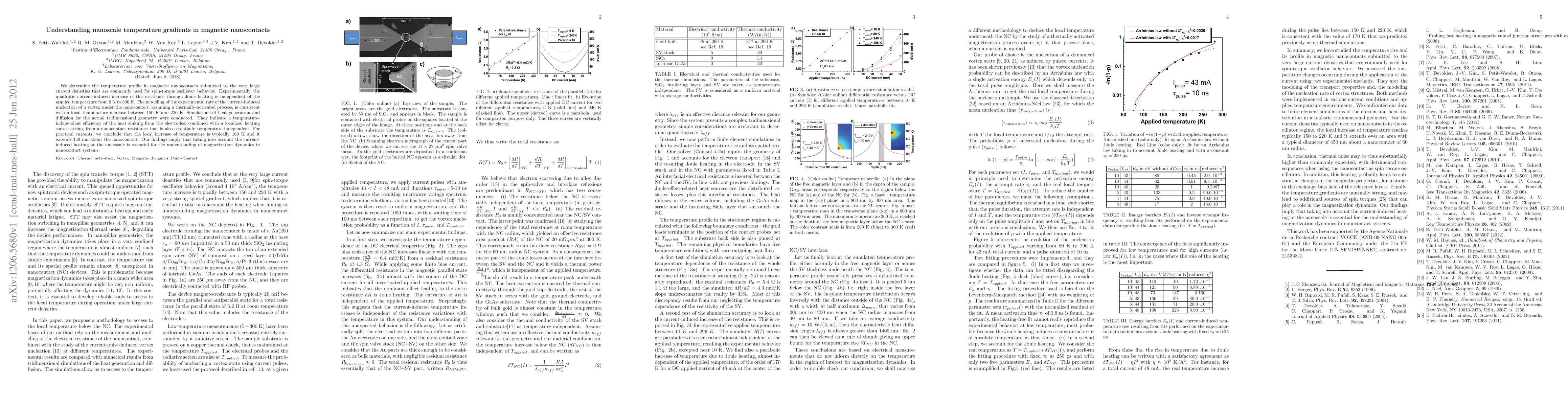 We determine the temperature profile in magnetic nanocontacts submitted to the very large current densities that are commonly used for spin-torque oscillator behavior. Experimentally, the quadratic current-induced increase of the resistance through Joule heating is independent of the applied temperature from 6 K to 300 K. The modeling of the experimental rate of the current-induced nucleation of a vortex under the nanocontact, assuming a thermally-activated process, is consistent with a local temperature increase between 150 K and 220 K. Simulations of heat generation and diffusion for the actual tridimensional geometry were conducted. They indicate a temperature-independent efficiency of the heat sinking from the electrodes, combined with a localized heating source arising from a nanocontact resistance that is also essentially temperature-independent. For practical currents, we conclude that the local increase of temperature is typically 160 K and it extends 450 nm about the nanocontact. Our findings imply that taking into account the current-induced heating at the nanoscale is essential for the understanding of magnetization dynamics in nanocontact systems.