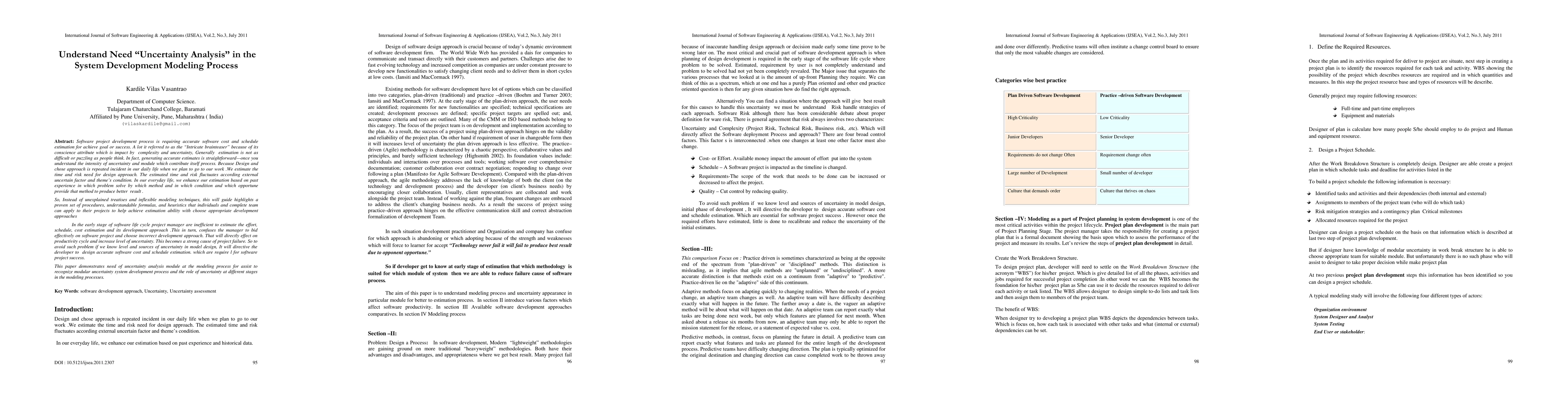 Software project development process is requiring accurate software cost and schedule estimation for achieve goal or success. A lot it referred to as the "Intricate brainteaser" because of its conscience attribute which is impact by complexity and uncertainty, Generally estimation is not as difficult or puzzling as people think. In fact, generating accurate estimates is straightforward-once you understand the intensity of uncertainty and module which contribute itself process. In our everyday life, we enhance our estimation based on past experience in which problem solve by which method and in which condition and which opportune provide that method to produce better result . So, Instead of unexplained treatises and inflexible modeling techniques, this will guide highlights a proven set of procedures, understandable formulas, and heuristics that individuals and complete team can apply to their projects to help achieve estimation ability with choose appropriate development approaches In the early stage of software life cycle project manager are inefficient to estimate the effort, schedule, cost estimation and its development approach .This in turn, confuses the manager to bid effectively on software project and choose incorrect development approach. That will directly effect on productivity cycle and increase level of uncertainty. This becomes a strong cause of project failure. So to avoid such problem if we know level and sources of uncertainty in model design, It will directive the developer to design accurate software cost and schedule estimation. which are require l for software project success. This paper demonstrates need of uncertainty analysis module at the modeling process for assist to recognize modular uncertainty system development process and the role of uncertainty at different stages in the modeling