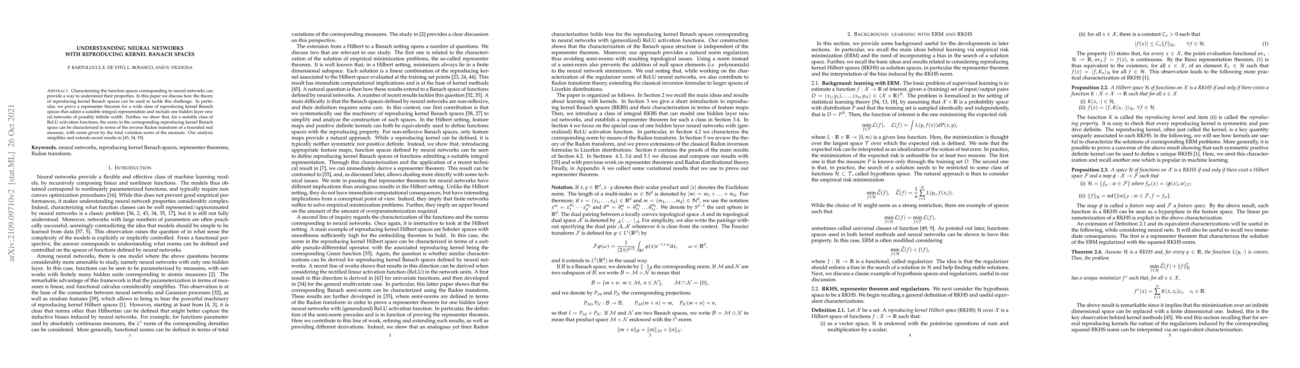 This paper utilizes the theory of reproducing kernel Banach spaces to characterize the function spaces of neural networks, proving a representer theorem for neural networks with one hidden layer. It also connects the norm in the corresponding Banach space to the inverse Radon transform of a bounded real measure, simplifying and extending recent results.