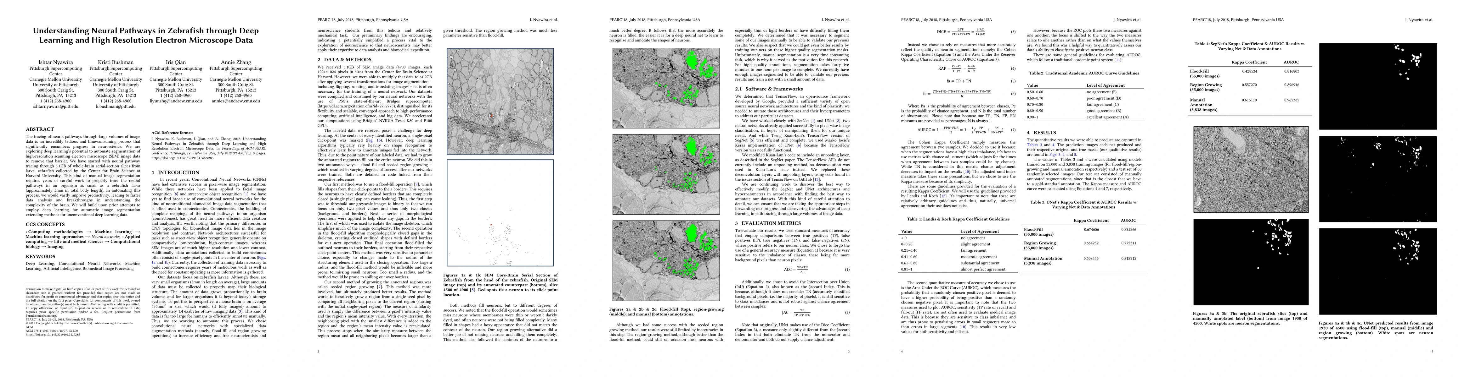 The tracing of neural pathways through large volumes of image data is an incredibly tedious and time-consuming process that significantly encumbers progress in neuroscience. We are exploring deep learning's potential to automate segmentation of high-resolution scanning electron microscope (SEM) image data to remove that barrier. We have started with neural pathway tracing through 5.1GB of whole-brain serial-section slices from larval zebrafish collected by the Center for Brain Science at Harvard University. This kind of manual image segmentation requires years of careful work to properly trace the neural pathways in an organism as small as a zebrafish larva (approximately 5mm in total body length). In automating this process, we would vastly improve productivity, leading to faster data analysis and breakthroughs in understanding the complexity of the brain. We will build upon prior attempts to employ deep learning for automatic image segmentation extending methods for unconventional deep learning data.