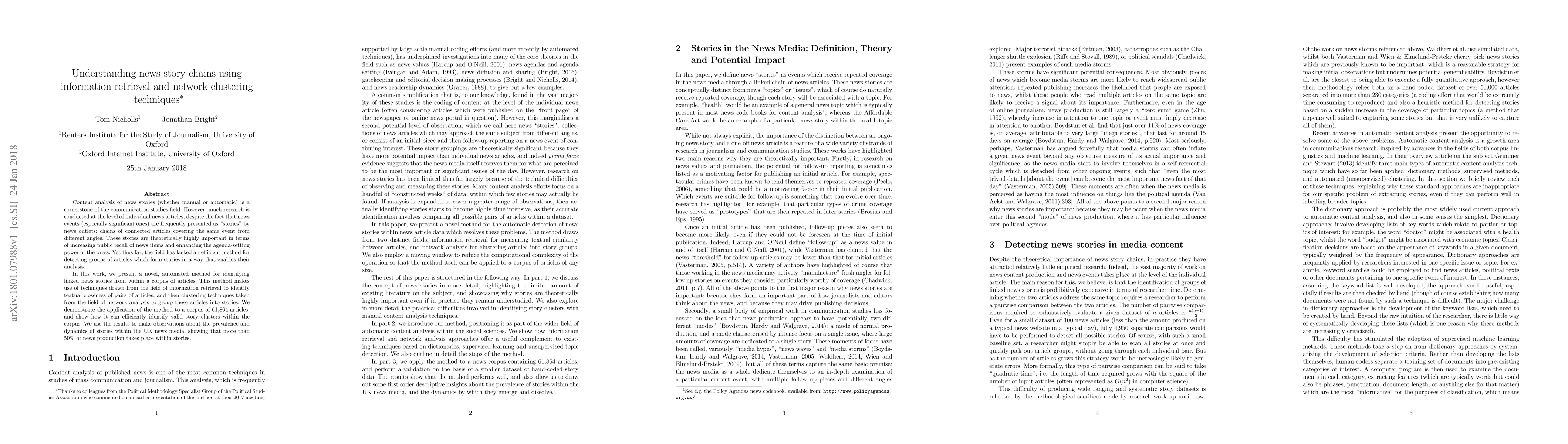 Researchers developed a novel method to identify linked news stories from articles, using information retrieval and network clustering techniques, and found that over 50% of news production in the UK takes place within these story chains.