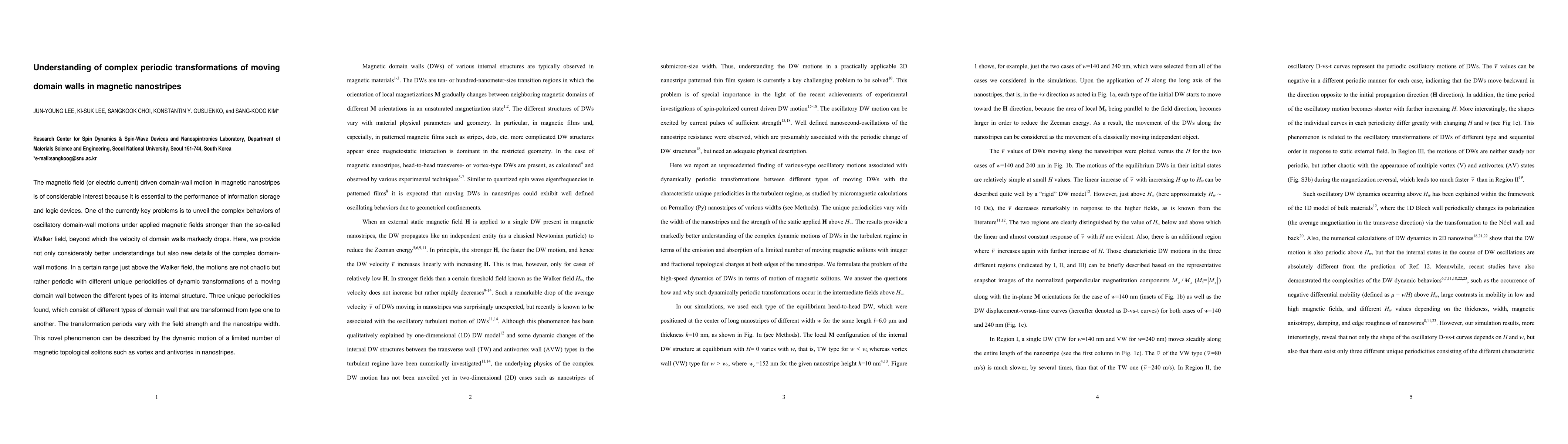 The magnetic field (or electric current) driven domain-wall motion in magnetic nanostripes is of considerable interest because it is essential to the performance of information storage and logic devices. One of the currently key problems is to unveil the complex behaviors of oscillatory domain-wall motions under applied magnetic fields stronger than the so-called Walker field, beyond which the velocity of domain walls markedly drops. Here, we provide not only considerably better understandings but also new details of the complex domain-wall motions. In a certain range just above the Walker field, the motions are not chaotic but rather periodic with different unique periodicities of dynamic transformations of a moving domain wall between the different types of its internal structure. Three unique periodicities found, which consist of different types of domain wall that are transformed from type one to another. The transformation periods vary with the field strength and the nanostripe width. This novel phenomenon can be described by the dynamic motion of a limited number of magnetic topological solitons such as vortex and antivortex in nanostripes.