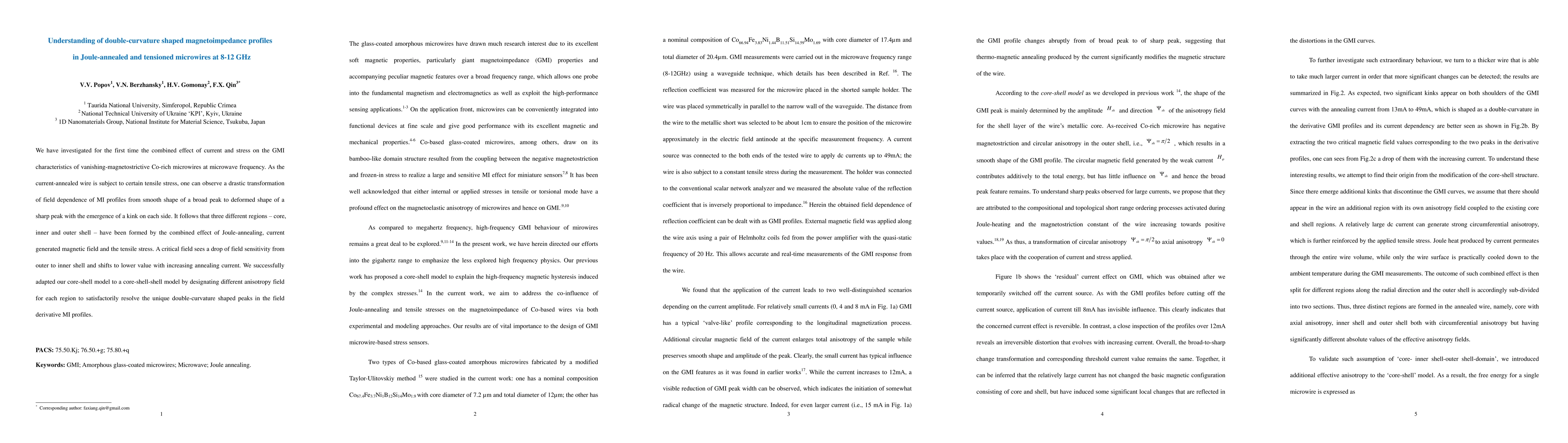 We have investigated for the first time the combined effect of current and stress on the GMI characteristics of vanishing-magnetostrictive Co-rich microwires at microwave frequency. As the current-annealed wire is subject to certain tensile stress, one can observe a drastic transformation of field dependence of MI profiles from smooth shape of a broad peak to deformed shape of a sharp peak with the emergence of a kink on each side. It follows that three different regions- core, inner and outer shell -have been formed by the combined effect of Joule annealing, current generated magnetic field and the tensile stress. A critical field sees a drop of field sensitivity from outer to inner shell and shifts to lower value with increasing annealing current. We successfully adapted our core-shell model to a core-shell-shell model by designating different anisotropy field for each region to satisfactorily resolve the unique double-curvature shaped peaks in the field derivative MI profiles.