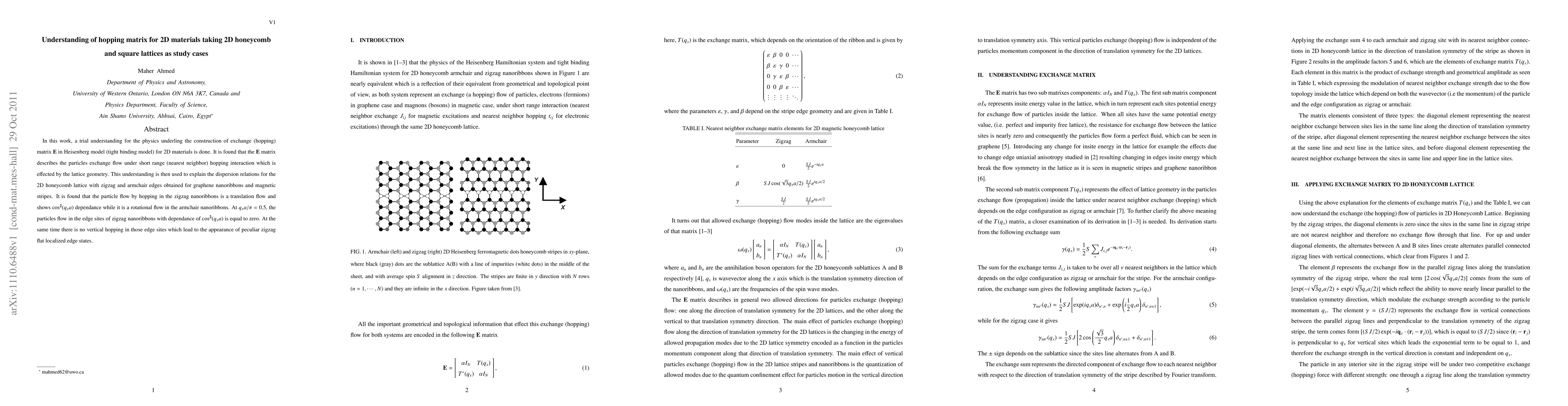 In this work, a trial understanding for the physics underling the construction of exchange (hopping) matrix $\mathbf{E}$ in Heisenberg model (tight binding model) for 2D materials is done. It is found that the $\mathbf{E}$ matrix describes the particles exchange flow under short range (nearest neighbor) hopping interaction which is effected by the lattice geometry. This understanding is then used to explain the dispersion relations for the 2D honeycomb lattice with zigzag and armchair edges obtained for graphene nanoribbons and magnetic stripes. It is found that the particle flow by hopping in the zigzag nanoribbons is a translation flow and shows $\mathbf{\cos^2}(q_xa)$ dependance while it is a rotational flow in the armchair nanoribbons. At $q_xa/\pi=0.5$, the particles flow in the edge sites of zigzag nanoribbons with dependance of $\mathbf{\cos^2}(q_xa)$ is equal to zero. At the same time there is no vertical hopping in those edge sites which lead to the appearance of peculiar zigzag flat localized edge states.