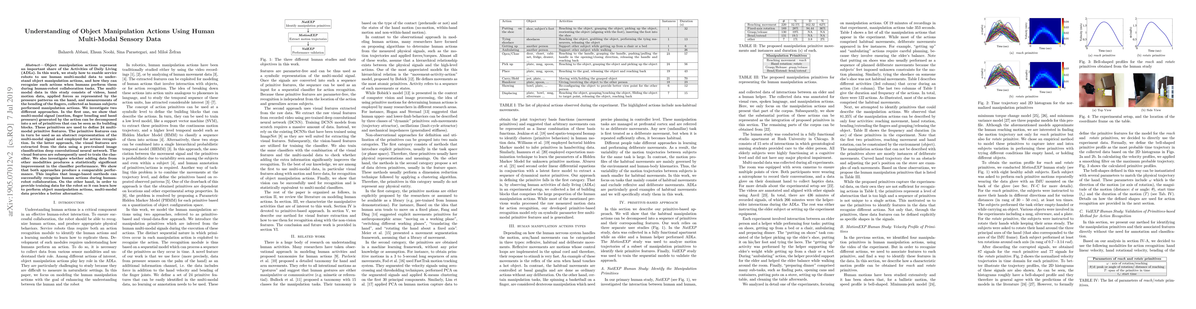 This paper explores how service robots can understand human object manipulation actions using multi-modal sensory data, including videos, hand motion, and pressure patterns. It evaluates two approaches: one decomposing multi-modal signals into primitive features for action recognition, and a visual-only approach using deep neural networks. Both methods show comparable performance, indicating that while visual methods suffice for recognition, multi-modal data is superior for training robots to perform manipulation tasks.