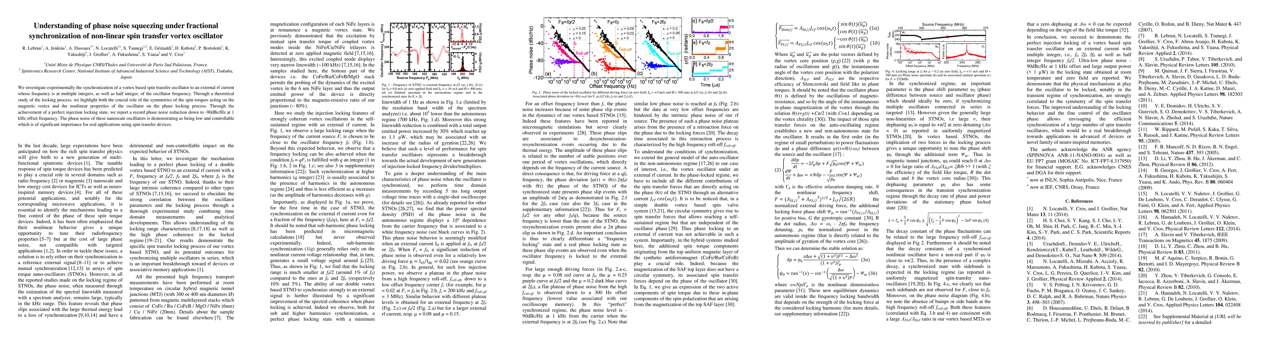 This paper experimentally investigates the synchronization of a nanoscale vortex-based spin transfer oscillator to an external rf current, achieving fractional synchronization. The study reveals the importance of spin torque symmetries and oscillator nonlinearity in the phase locking process, leading to a record phase noise reduction of -90dBc/Hz at 1 kHz offset, demonstrating the potential of these oscillators for practical spin transfer applications.