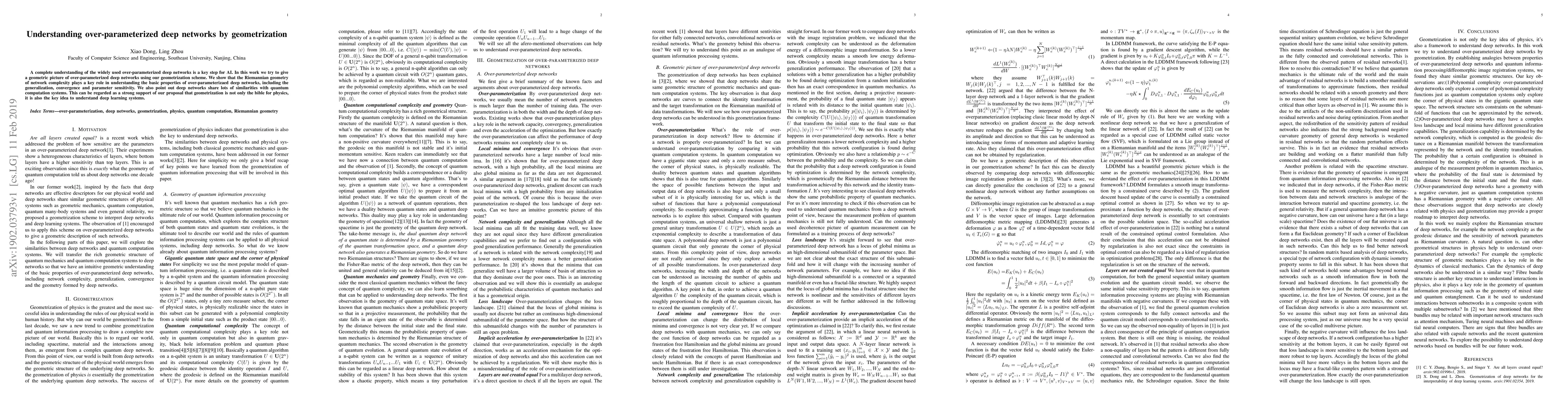 A complete understanding of the widely used over-parameterized deep networks is a key step for AI. In this work we try to give a geometric picture of over-parameterized deep networks using our geometrization scheme. We show that the Riemannian geometry of network complexity plays a key role in understanding the basic properties of over-parameterizaed deep networks, including the generalization, convergence and parameter sensitivity. We also point out deep networks share lots of similarities with quantum computation systems. This can be regarded as a strong support of our proposal that geometrization is not only the bible for physics, it is also the key idea to understand deep learning systems.