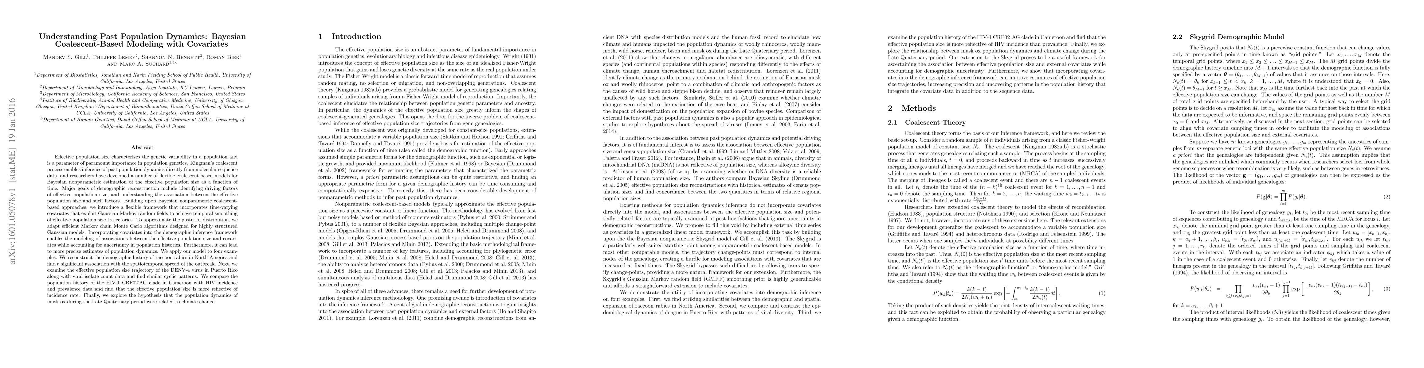 This paper introduces a Bayesian coalescent-based modeling framework incorporating time-varying covariates to infer past population dynamics, demonstrating its application in reconstructing the demographic histories of raccoon rabies, DENV-4 virus, HIV-1 CRF02_AG clade, and musk ox, revealing significant associations with spatiotemporal spread, viral isolate counts, HIV incidence, and climate change, respectively.