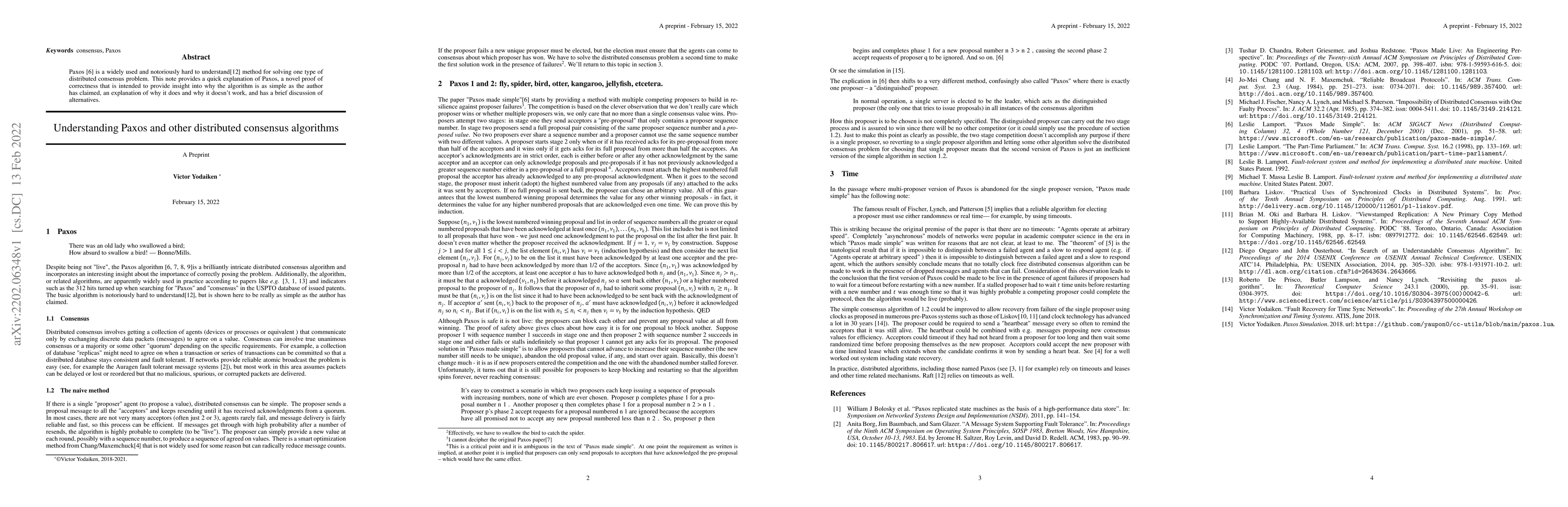 This paper offers a simplified explanation of Paxos, a fundamental distributed consensus algorithm, and presents a novel proof of its correctness. It also discusses the algorithm's strengths and limitations and briefly explores alternative consensus methods.