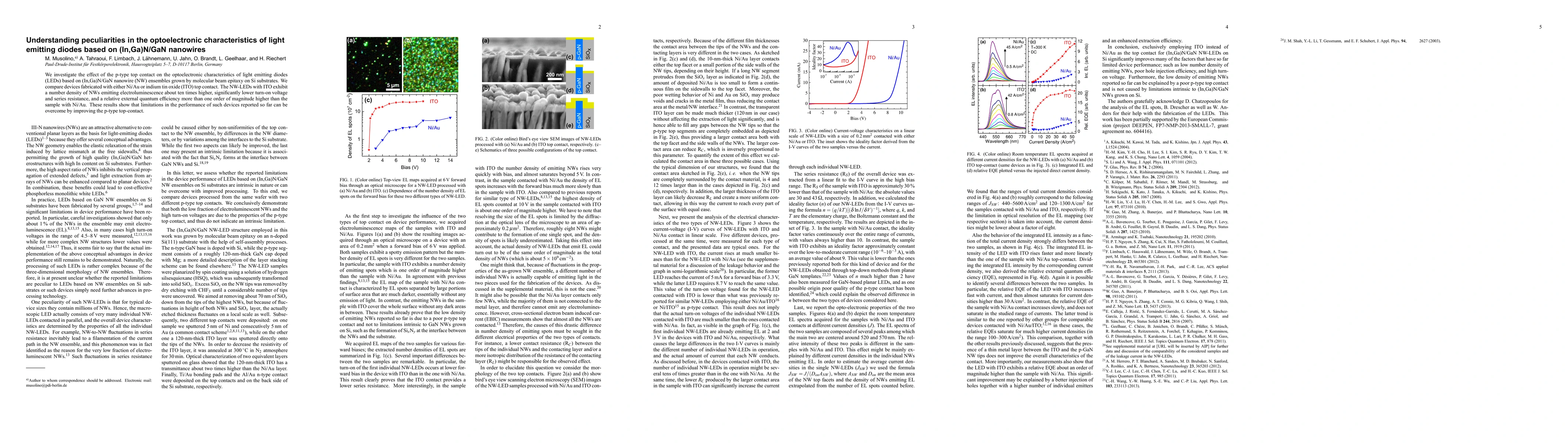 This study examines the optoelectronic characteristics of (In,Ga)N/GaN nanowire LEDs with different p-type top contacts, finding that ITO-based devices show significantly improved performance, including higher emitting density, lower turn-on voltage, and greater external quantum efficiency compared to Ni/Au-based devices.