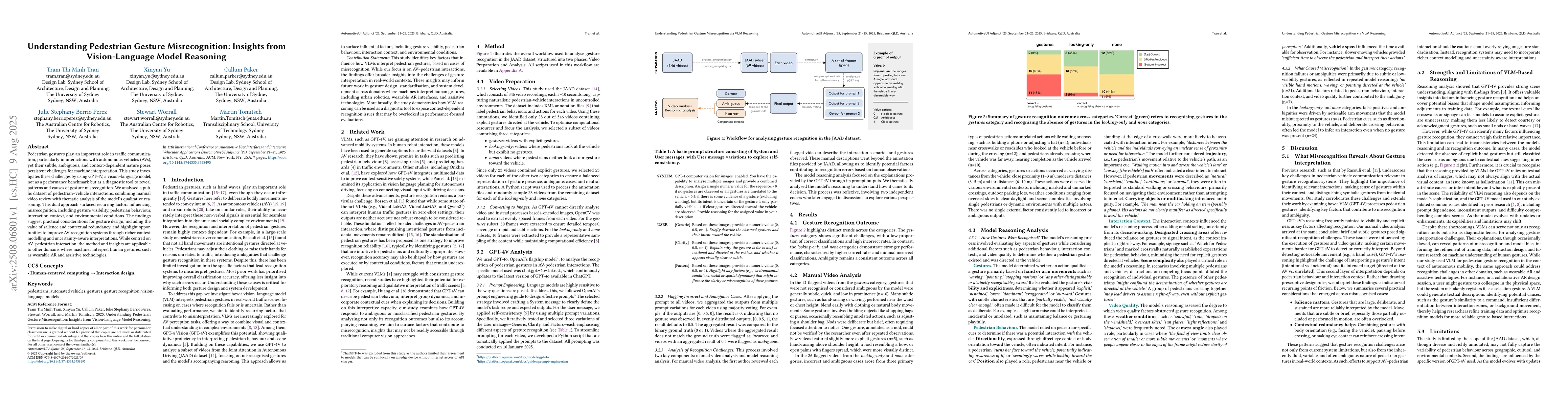 This work extends previous research by examining how a VLM (GPT-4V) processes pedestrian gestures, identifying key factors contributing to misrecognition and ambiguity, and offering practical considerations for gesture design and system development.