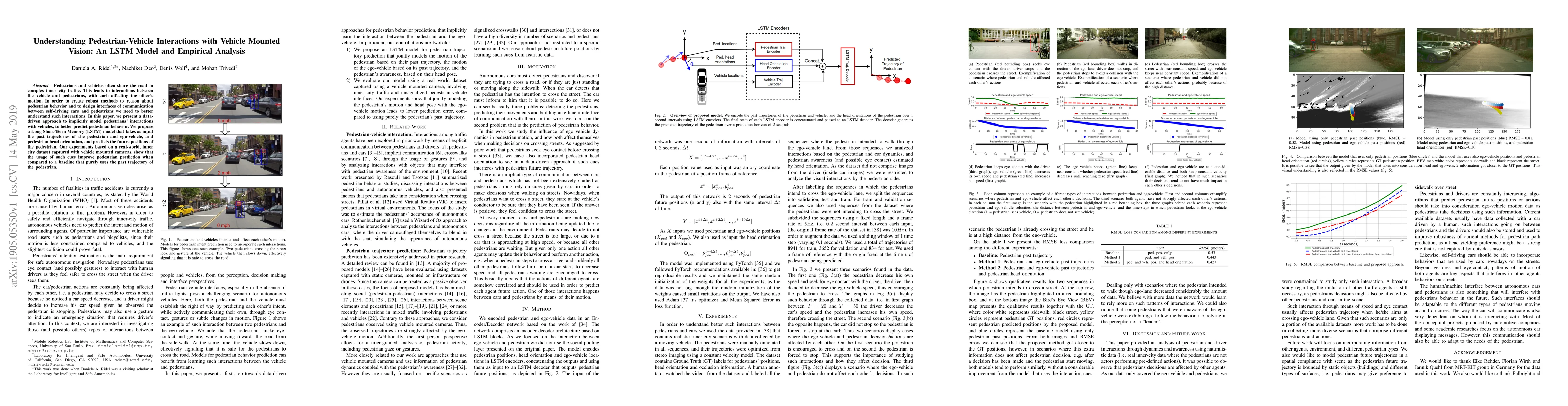 Pedestrians and vehicles often share the road in complex inner city traffic. This leads to interactions between the vehicle and pedestrians, with each affecting the other's motion. In order to create robust methods to reason about pedestrian behavior and to design interfaces of communication between self-driving cars and pedestrians we need to better understand such interactions. In this paper, we present a data-driven approach to implicitly model pedestrians' interactions with vehicles, to better predict pedestrian behavior. We propose a LSTM model that takes as input the past trajectories of the pedestrian and ego-vehicle, and pedestrian head orientation, and predicts the future positions of the pedestrian. Our experiments based on a real-world, inner city dataset captured with vehicle mounted cameras, show that the usage of such cues improve pedestrian prediction when compared to a baseline that purely uses the past trajectory of the pedestrian.