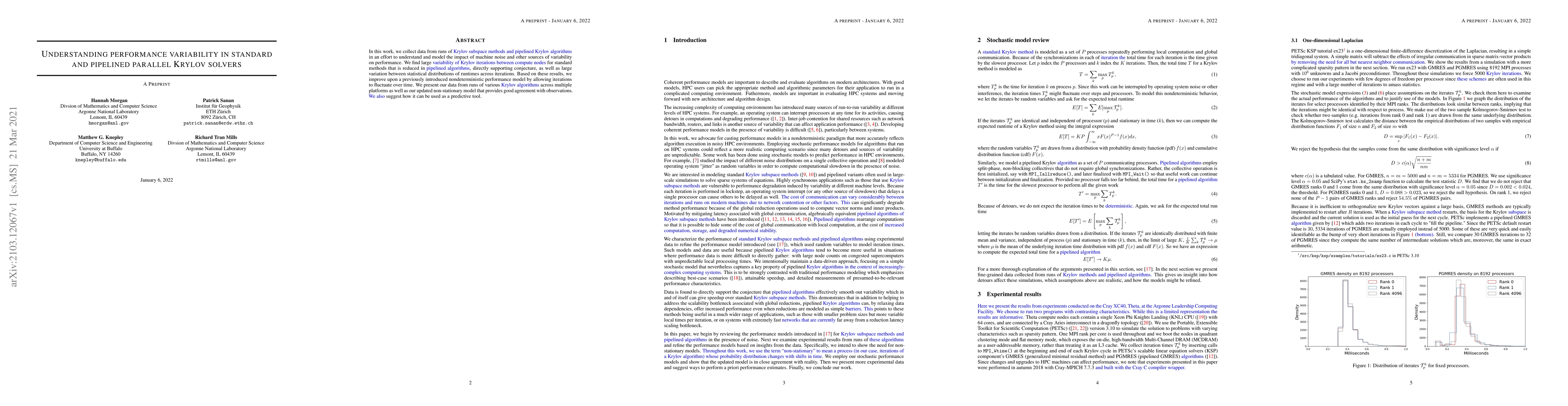 Researchers studied Krylov solvers for parallel computing, finding that pipelined algorithms reduce variability between nodes, but runtimes vary significantly across iterations. They developed an improved performance model allowing for non-stationary fluctuations over time.