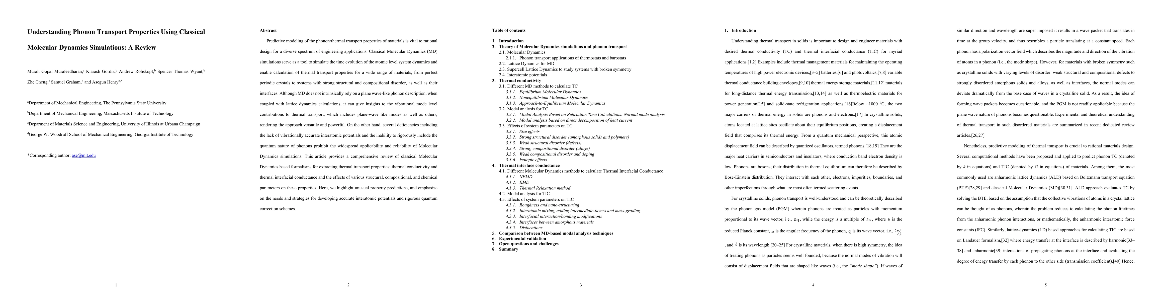 This paper reviews classical Molecular Dynamics simulations for predicting phonon/thermal transport properties in materials, highlighting their versatility and limitations, and discusses strategies for improving interatomic potentials and quantum corrections. It focuses on thermal conductivity and interfacial conductance, and the impact of structural and compositional factors.