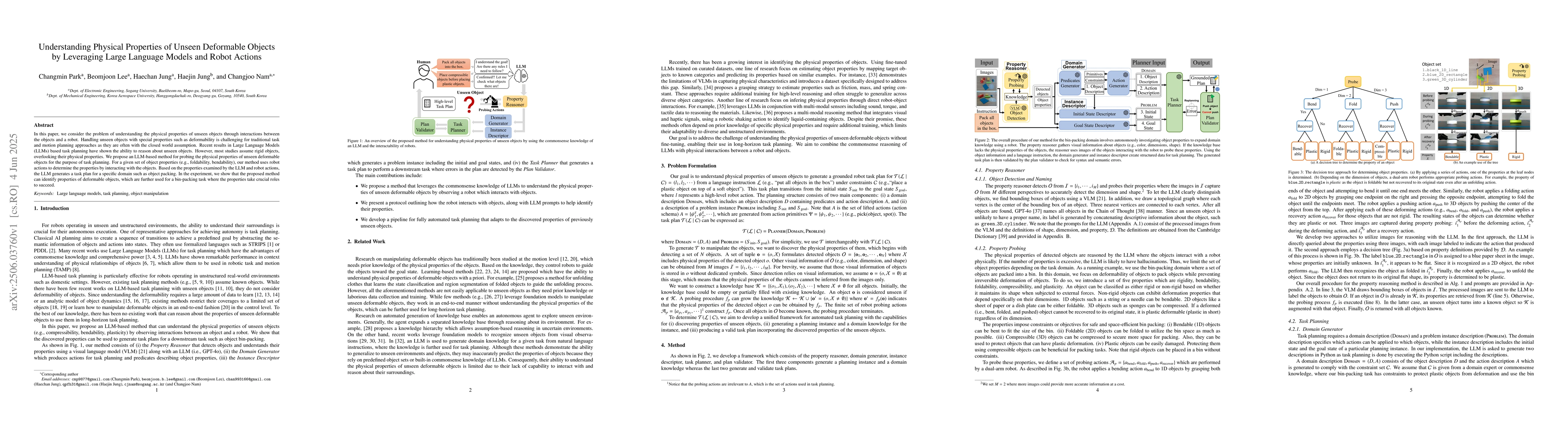 The research proposes an LLM-based method that uses robot actions to probe and identify physical properties of unseen deformable objects, generating task plans based on these properties for tasks like object packing.