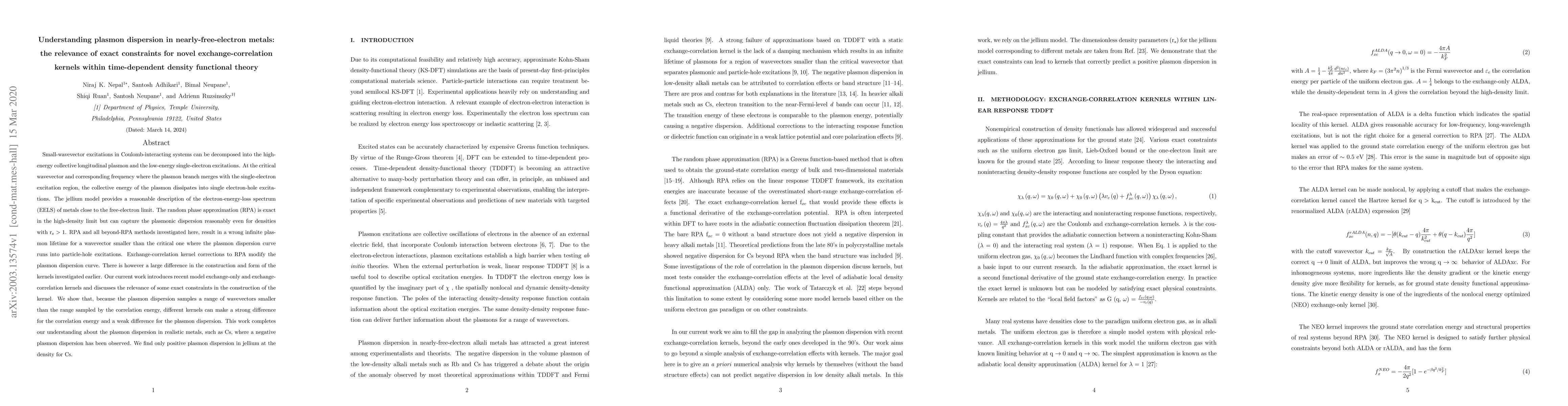 This paper investigates the plasmon dispersion in nearly-free-electron metals using time-dependent density functional theory, focusing on the impact of novel exchange-correlation kernels. It reveals that different kernels can significantly affect correlation energy but have a lesser impact on plasmon dispersion, thus providing a deeper understanding of plasmon behavior in metals like Cs.