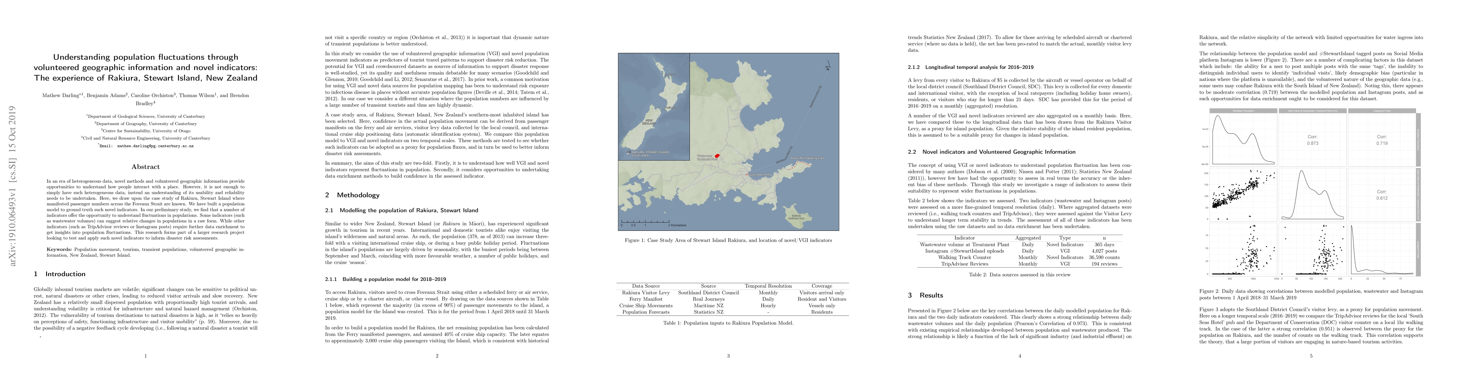 In an era of heterogeneous data, novel methods and volunteered geographic information provide opportunities to understand how people interact with a place. However, it is not enough to simply have such heterogeneous data, instead an understanding of its usability and reliability needs to be undertaken. Here, we draw upon the case study of Rakiura, Stewart Island where manifested passenger numbers across the Foveaux Strait are known. We have built a population model to ground truth such novel indicators. In our preliminary study, we find that a number of indicators offer the opportunity to understand fluctuations in populations. Some indicators (such as wastewater volumes) can suggest relative changes in populations in a raw form. While other indicators (such as TripAdvisor reviews or Instagram posts) require further data enrichment to get insights into population fluctuations. This research forms part of a larger research project looking to test and apply such novel indicators to inform disaster risk assessments.