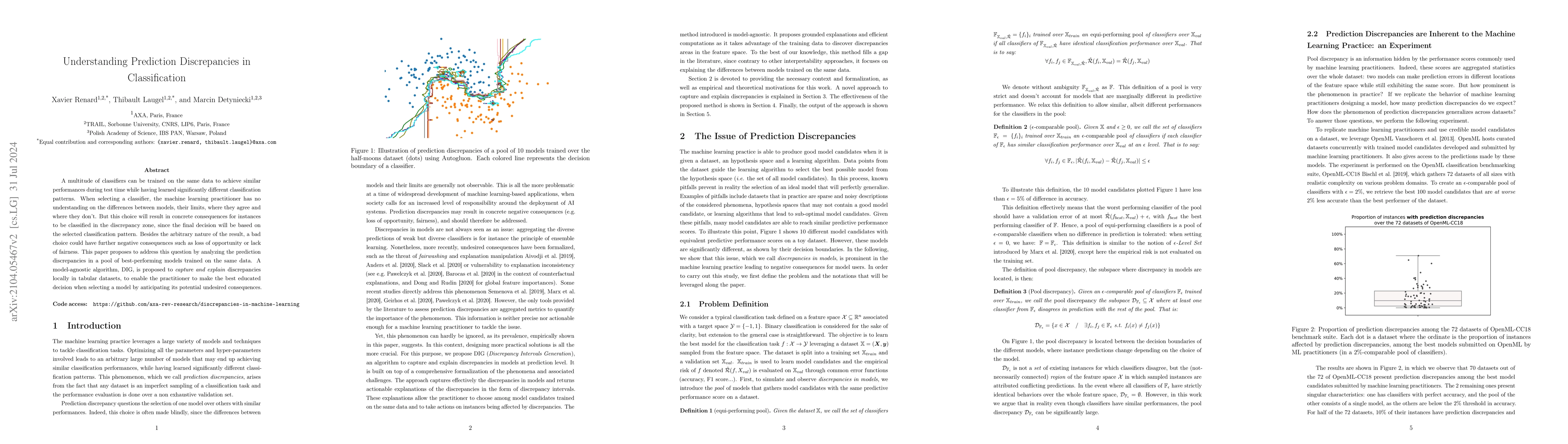 A multitude of classifiers can be trained on the same data to achieve similar performances during test time, while having learned significantly different classification patterns. This phenomenon, which we call prediction discrepancies, is often associated with the blind selection of one model instead of another with similar performances. When making a choice, the machine learning practitioner has no understanding on the differences between models, their limits, where they agree and where they don't. But his/her choice will result in concrete consequences for instances to be classified in the discrepancy zone, since the final decision will be based on the selected classification pattern. Besides the arbitrary nature of the result, a bad choice could have further negative consequences such as loss of opportunity or lack of fairness. This paper proposes to address this question by analyzing the prediction discrepancies in a pool of best-performing models trained on the same data. A model-agnostic algorithm, DIG, is proposed to capture and explain discrepancies locally, to enable the practitioner to make the best educated decision when selecting a model by anticipating its potential undesired consequences. All the code to reproduce the experiments is available.