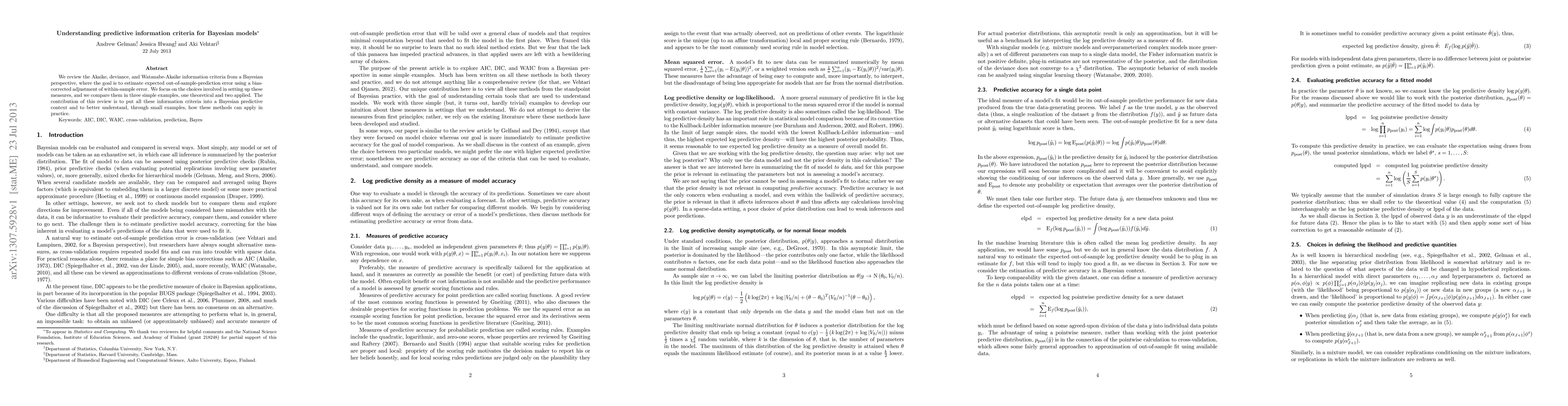 We review the Akaike, deviance, and Watanabe-Akaike information criteria from a Bayesian perspective, where the goal is to estimate expected out-of-sample-prediction error using a biascorrected adjustment of within-sample error. We focus on the choices involved in setting up these measures, and we compare them in three simple examples, one theoretical and two applied. The contribution of this review is to put all these information criteria into a Bayesian predictive context and to better understand, through small examples, how these methods can apply in practice.