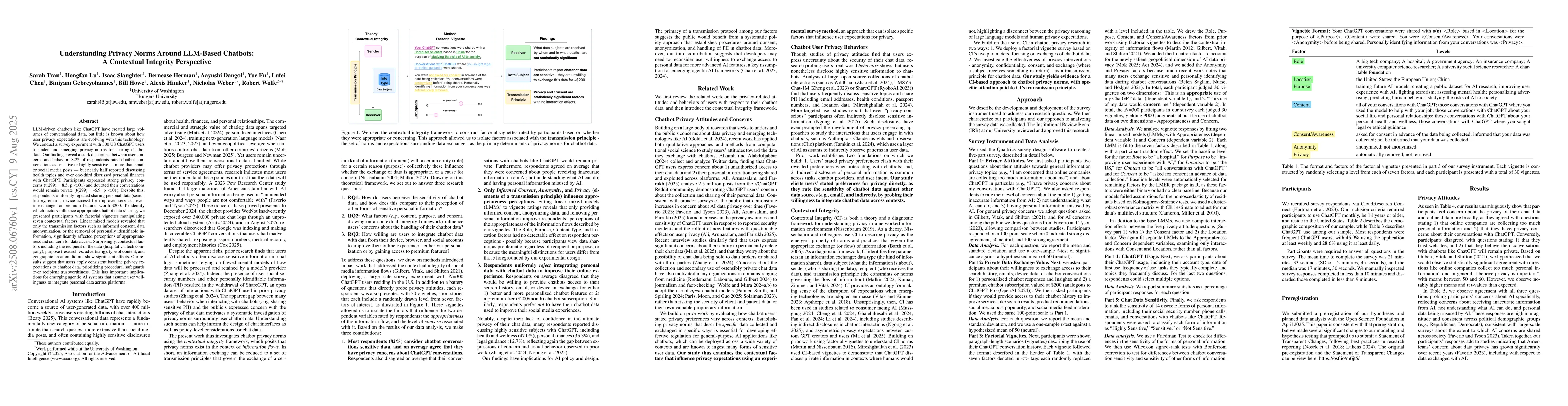 The study presents a contextual integrity perspective on privacy norms around LLM-based chatbots, employing linear mixed models to analyze the impact of contextual factors on perceptions of appropriate data sharing.