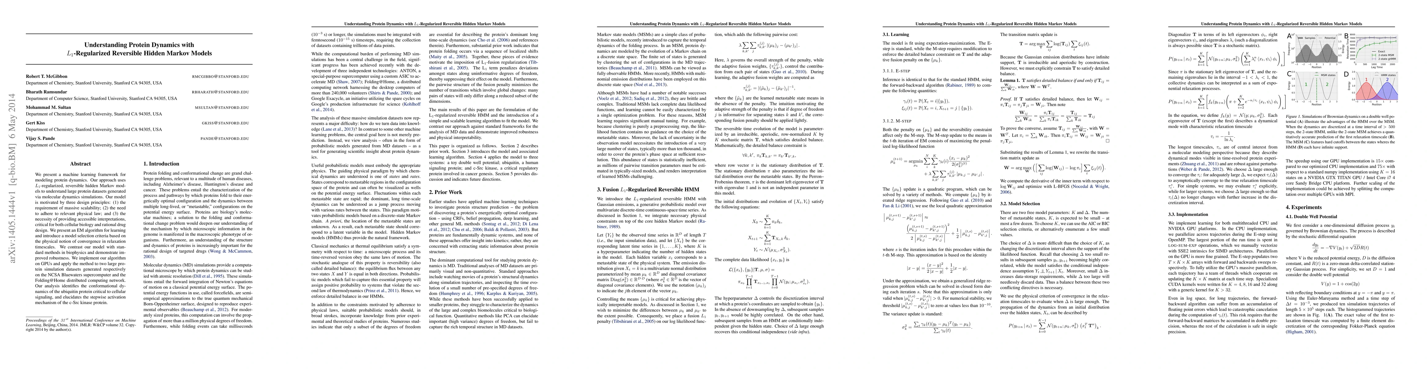 We present a machine learning framework for modeling protein dynamics. Our approach uses L1-regularized, reversible hidden Markov models to understand large protein datasets generated via molecular dynamics simulations. Our model is motivated by three design principles: (1) the requirement of massive scalability; (2) the need to adhere to relevant physical law; and (3) the necessity of providing accessible interpretations, critical for both cellular biology and rational drug design. We present an EM algorithm for learning and introduce a model selection criteria based on the physical notion of convergence in relaxation timescales. We contrast our model with standard methods in biophysics and demonstrate improved robustness. We implement our algorithm on GPUs and apply the method to two large protein simulation datasets generated respectively on the NCSA Bluewaters supercomputer and the Folding@Home distributed computing network. Our analysis identifies the conformational dynamics of the ubiquitin protein critical to cellular signaling, and elucidates the stepwise activation mechanism of the c-Src kinase protein.