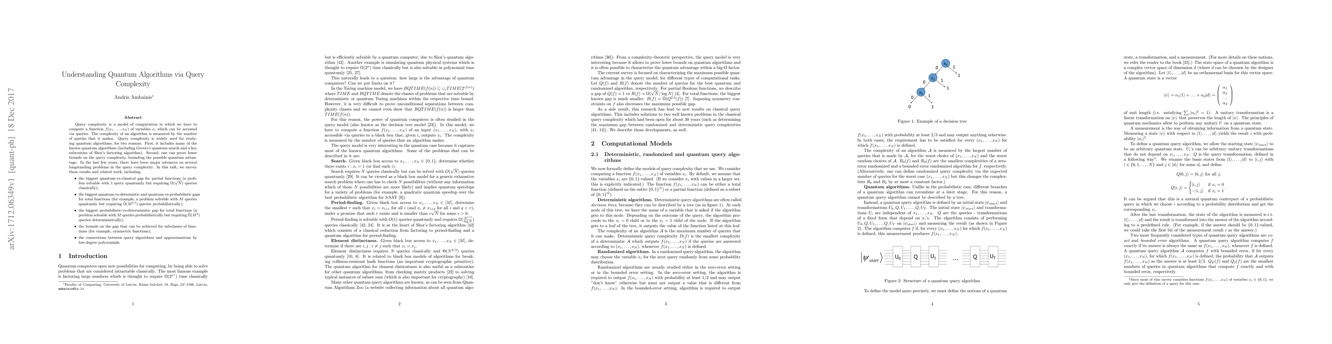 Query complexity is a model of computation in which we have to compute a function $f(x_1, \ldots, x_N)$ of variables $x_i$ which can be accessed via queries. The complexity of an algorithm is measured by the number of queries that it makes. Query complexity is widely used for studying quantum algorithms, for two reasons. First, it includes many of the known quantum algorithms (including Grover's quantum search and a key subroutine of Shor's factoring algorithm). Second, one can prove lower bounds on the query complexity, bounding the possible quantum advantage. In the last few years, there have been major advances on several longstanding problems in the query complexity. In this talk, we survey these results and related work, including: - the biggest quantum-vs-classical gap for partial functions (a problem solvable with 1 query quantumly but requiring $\Omega(\sqrt{N})$ queries classically); - the biggest quantum-vs-determistic and quantum-vs-probabilistic gaps for total functions (for example, a problem solvable with $M$ queries quantumly but requiring $\tilde{\Omega}(M^{2.5})$ queries probabilistically); - the biggest probabilistic-vs-deterministic gap for total functions (a problem solvable with $M$ queries probabilistically but requiring $\tilde{\Omega}(M^{2})$ queries deterministically); - the bounds on the gap that can be achieved for subclasses of functions (for example, symmetric functions); - the connections between query algorithms and approximations by low-degree polynomials.