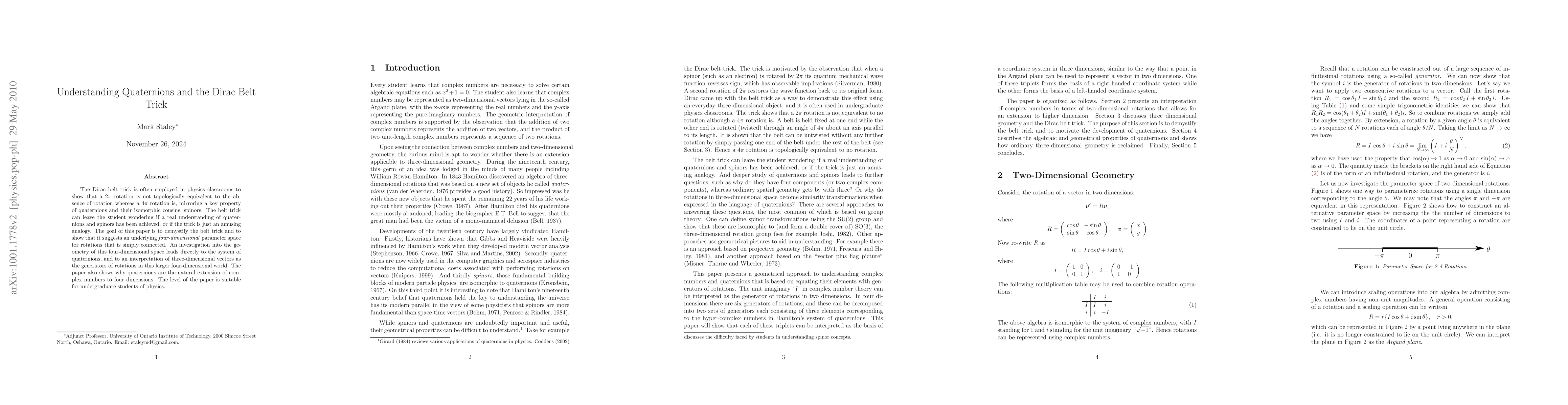 This paper demystifies the Dirac belt trick, illustrating its connection to quaternions and spinors, and demonstrates the underlying four-dimensional parameter space for rotations. It elucidates why quaternions are the natural extension of complex numbers to four dimensions, suitable for undergraduate physics students.