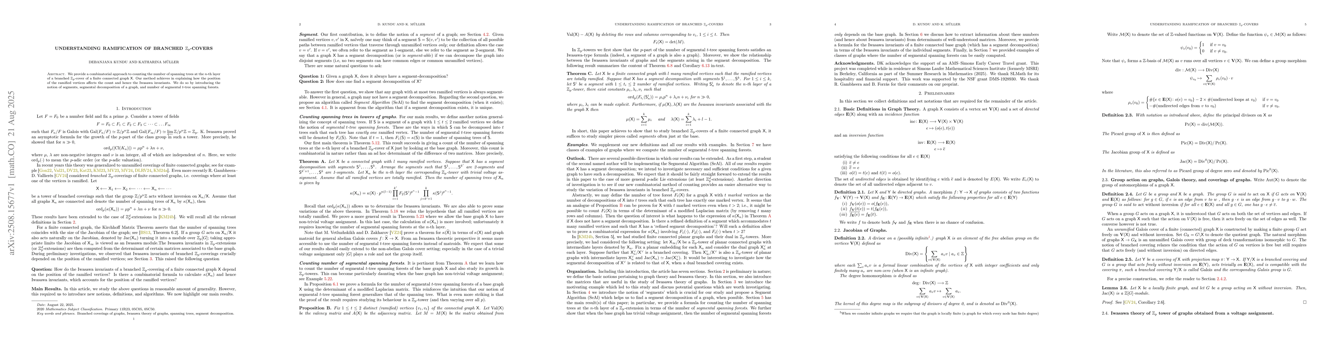 We provide a combinatorial approach to counting the number of spanning trees at the $n$-th layer of a branched $\mathbb{Z}_p$-cover of a finite connected graph $\mathsf{X}$. Our method achieves in explaining how the position of the ramified vertices affects the count and hence the Iwasawa invariants. We do so by introducing the notion of segments, segmental decomposition of a graph, and number of segmental $t$-tree spanning forests.