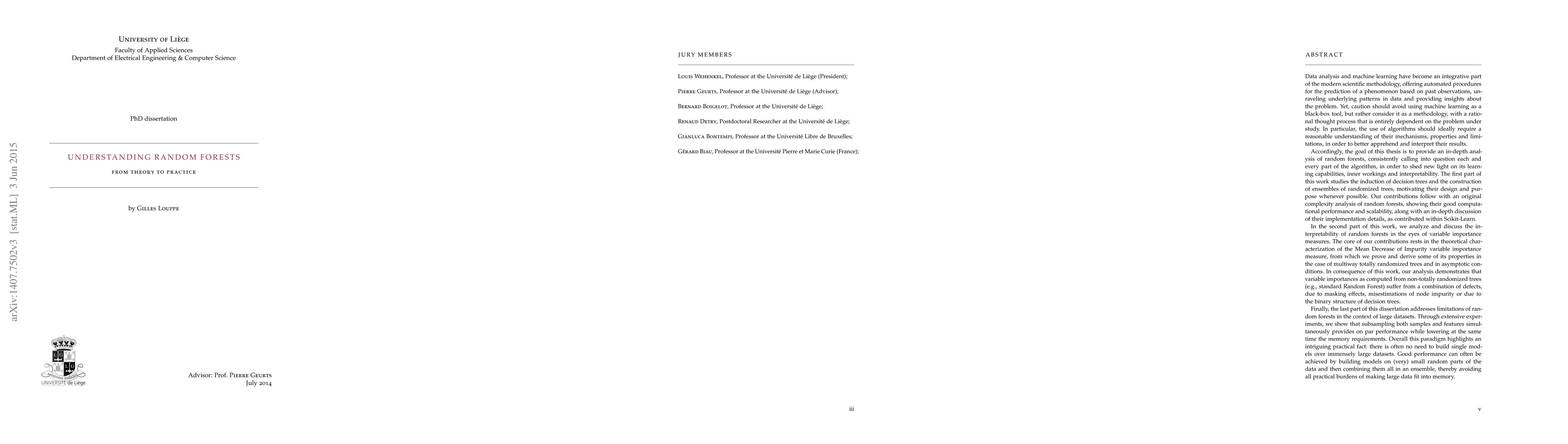 Data analysis and machine learning have become an integrative part of the modern scientific methodology, offering automated procedures for the prediction of a phenomenon based on past observations, unraveling underlying patterns in data and providing insights about the problem. Yet, caution should avoid using machine learning as a black-box tool, but rather consider it as a methodology, with a rational thought process that is entirely dependent on the problem under study. In particular, the use of algorithms should ideally require a reasonable understanding of their mechanisms, properties and limitations, in order to better apprehend and interpret their results. Accordingly, the goal of this thesis is to provide an in-depth analysis of random forests, consistently calling into question each and every part of the algorithm, in order to shed new light on its learning capabilities, inner workings and interpretability. The first part of this work studies the induction of decision trees and the construction of ensembles of randomized trees, motivating their design and purpose whenever possible. Our contributions follow with an original complexity analysis of random forests, showing their good computational performance and scalability, along with an in-depth discussion of their implementation details, as contributed within Scikit-Learn. In the second part of this work, we analyse and discuss the interpretability of random forests in the eyes of variable importance measures. The core of our contributions rests in the theoretical characterization of the Mean Decrease of Impurity variable importance measure, from which we prove and derive some of its properties in the case of multiway totally randomized trees and in asymptotic conditions. In consequence of this work, our analysis demonstrates that variable importances [...].