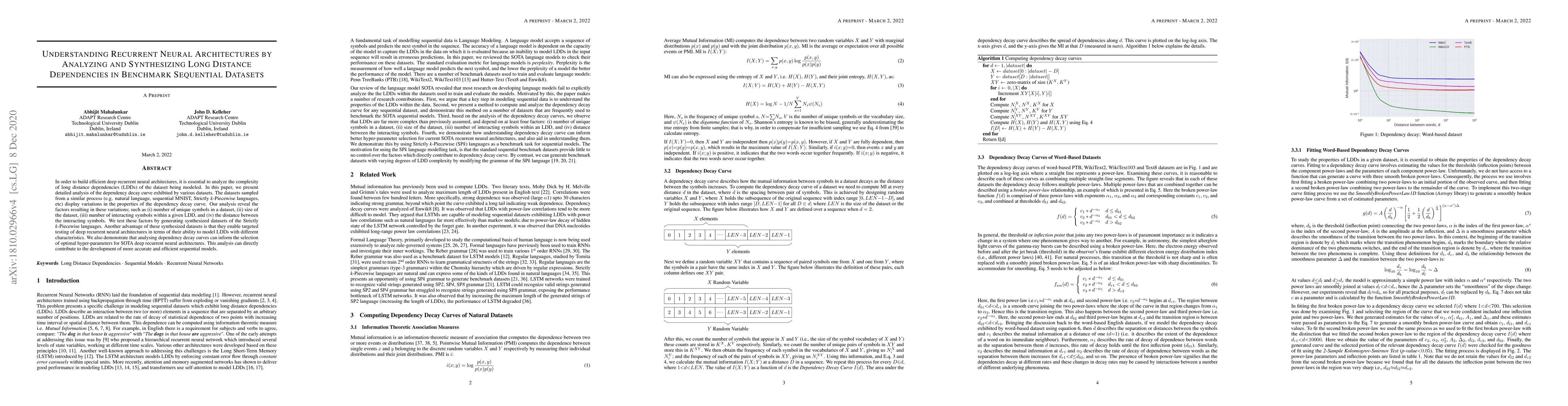 In order to build efficient deep recurrent neural architectures, it is essential to analyze the complexityof long distance dependencies (LDDs) of the dataset being modeled. In this paper, we presentdetailed analysis of the dependency decay curve exhibited by various datasets. The datasets sampledfrom a similar process (e.g. natural language, sequential MNIST, Strictlyk-Piecewise languages,etc) display variations in the properties of the dependency decay curve. Our analysis reveal thefactors resulting in these variations; such as (i) number of unique symbols in a dataset, (ii) size ofthe dataset, (iii) number of interacting symbols within a given LDD, and (iv) the distance betweenthe interacting symbols. We test these factors by generating synthesized datasets of the Strictlyk-Piecewise languages. Another advantage of these synthesized datasets is that they enable targetedtesting of deep recurrent neural architectures in terms of their ability to model LDDs with differentcharacteristics. We also demonstrate that analysing dependency decay curves can inform the selectionof optimal hyper-parameters for SOTA deep recurrent neural architectures. This analysis can directlycontribute to the development of more accurate and efficient sequential models.