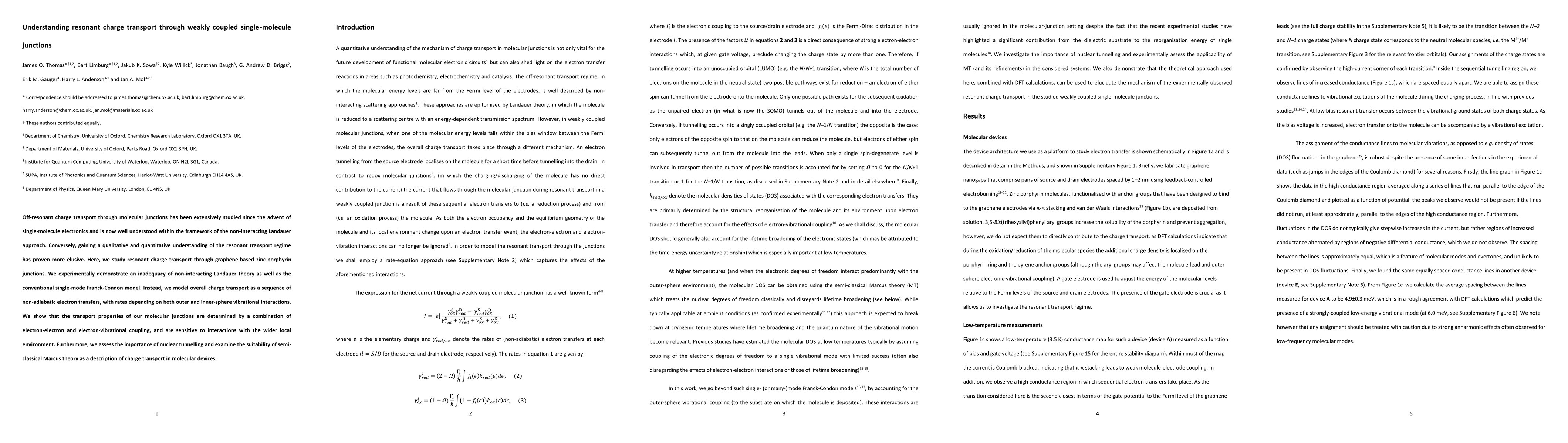 This research explores resonant charge transport in graphene-based zinc-porphyrin single-molecule junctions, finding that non-interacting Landauer theory and the Franck-Condon model are inadequate. The study models charge transport as a series of non-adiabatic electron transfers influenced by both vibrational interactions and the local environment, highlighting the significance of electron-electron and electron-vibrational coupling.