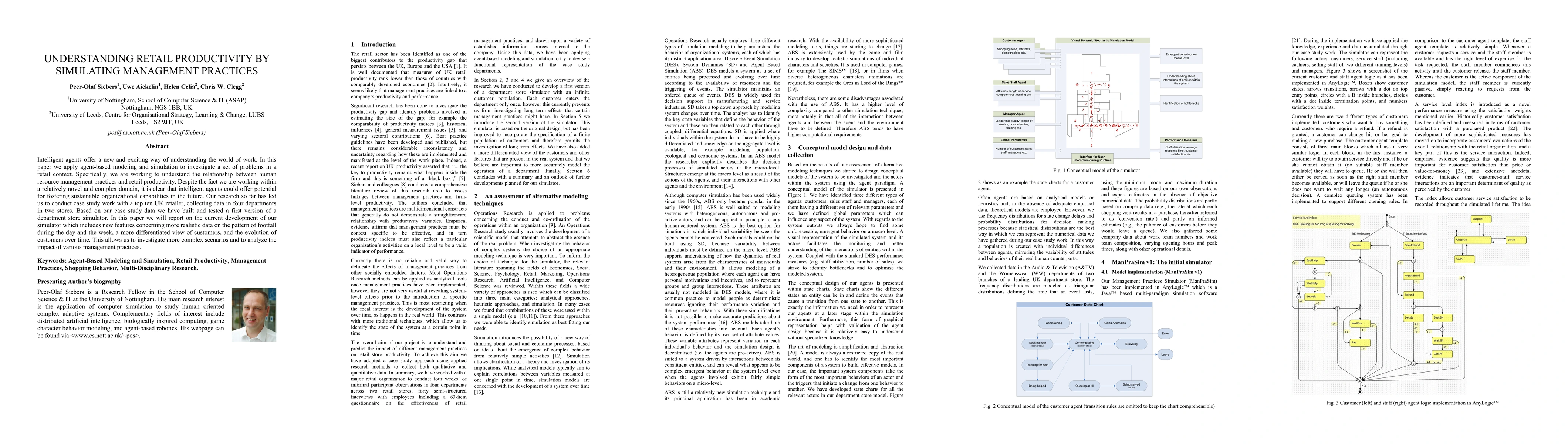 This paper explores the relationship between human resource management practices and retail productivity using agent-based modeling and simulation. The authors developed a department store simulator incorporating realistic footfall patterns, differentiated customer views, and customer evolution to analyze the impact of management practices on productivity.