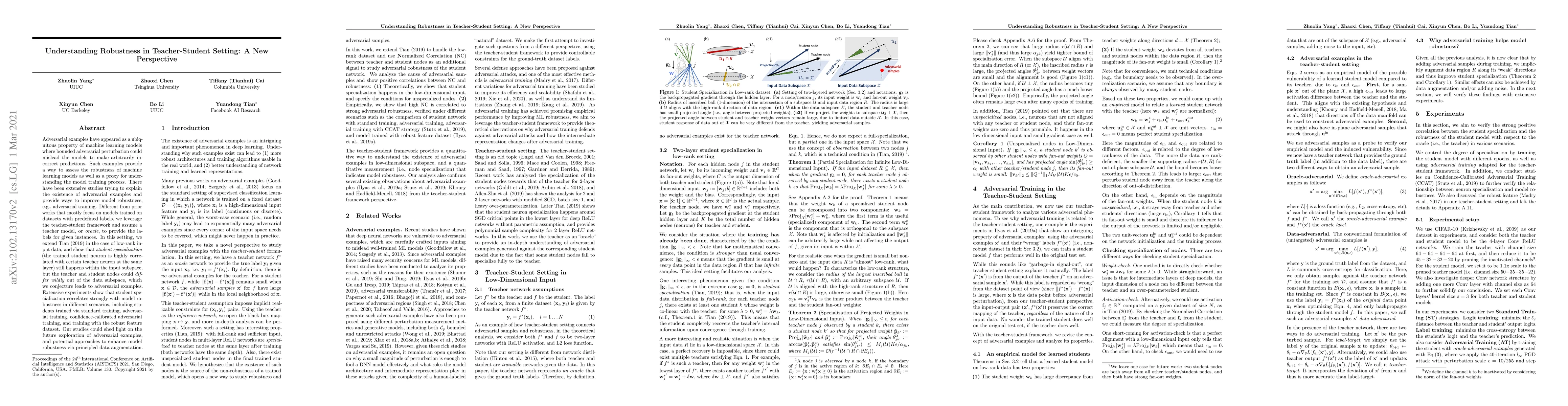 Adversarial examples have appeared as a ubiquitous property of machine learning models where bounded adversarial perturbation could mislead the models to make arbitrarily incorrect predictions. Such examples provide a way to assess the robustness of machine learning models as well as a proxy for understanding the model training process. Extensive studies try to explain the existence of adversarial examples and provide ways to improve model robustness (e.g. adversarial training). While they mostly focus on models trained on datasets with predefined labels, we leverage the teacher-student framework and assume a teacher model, or oracle, to provide the labels for given instances. We extend Tian (2019) in the case of low-rank input data and show that student specialization (trained student neuron is highly correlated with certain teacher neuron at the same layer) still happens within the input subspace, but the teacher and student nodes could differ wildly out of the data subspace, which we conjecture leads to adversarial examples. Extensive experiments show that student specialization correlates strongly with model robustness in different scenarios, including student trained via standard training, adversarial training, confidence-calibrated adversarial training, and training with robust feature dataset. Our studies could shed light on the future exploration about adversarial examples, and enhancing model robustness via principled data augmentation.