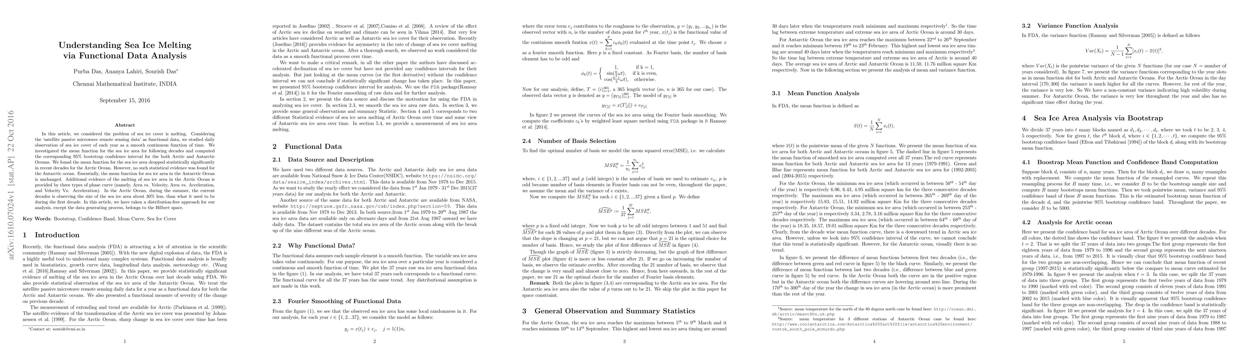 In this article, we considered the problem of sea ice cover is melting. Considering the `satellite passive microwave remote sensing data' as functional data, we studied daily observation of sea ice cover of each year as a smooth continuous function of time. We investigated the mean function for the sea ice area for following decades and computed the corresponding $95\%$ bootstrap confidence interval for the both Arctic and Antarctic Oceans. We found the mean function for the sea ice area dropped statistically significantly in recent decades for the Arctic Ocean. However, no such statistical evidence was found for the Antarctic ocean. Essentially, the mean function for sea ice area in the Antarctic Ocean is unchanged. Additional evidence of the melting of sea ice area in the Arctic Ocean is provided by three types of phase curve (namely, Area vs. Velocity, Area vs. Acceleration, and Velocity Vs. Acceleration). In the Arctic Ocean, during the summer, the current decades is observing the size of the sea ice area about $30\%$ less, than what it used to be during the first decade. In this article, we have taken a distribution-free approach for our analysis, except the data generating process, belongs to the Hilbert space.