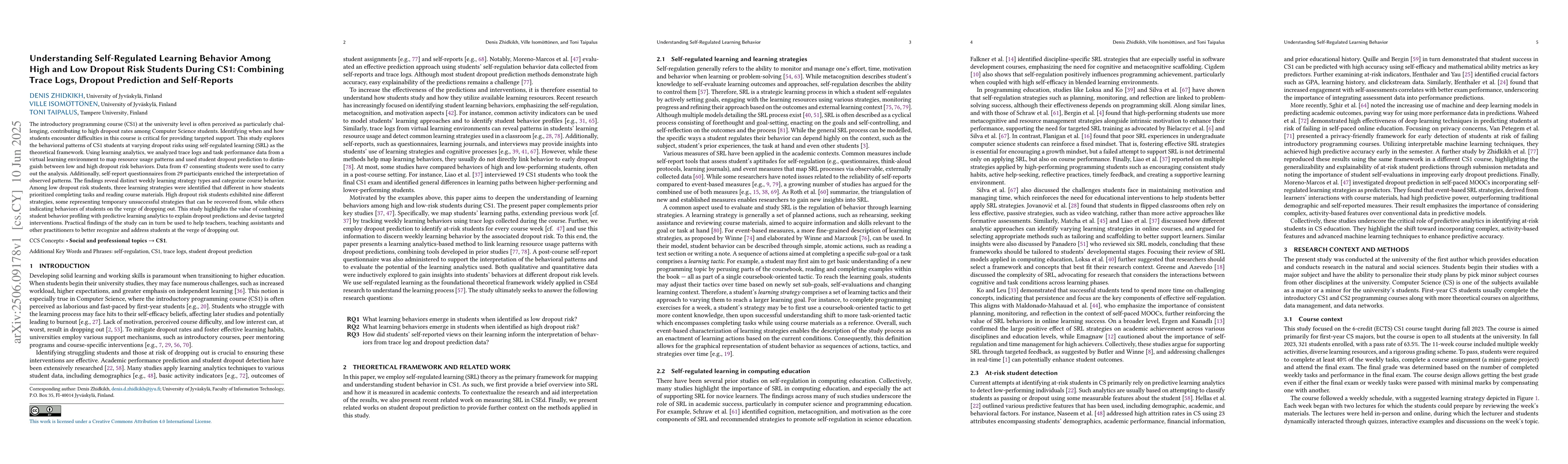 This study uses learning analytics to identify self-regulated learning strategies of university CS1 students at varying dropout risks, highlighting the value of combining behavior profiling with predictive analytics for targeted interventions.