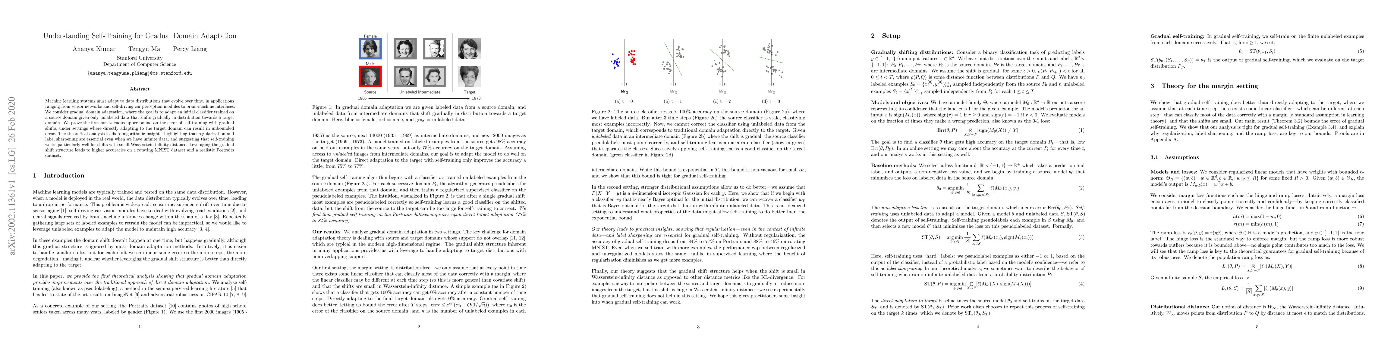This paper investigates self-training for gradual domain adaptation, proving the first non-vacuous upper bound on its error under gradual distribution shifts. It highlights the importance of regularization and label sharpening, showing improved performance on datasets like rotating MNIST and Portraits.
